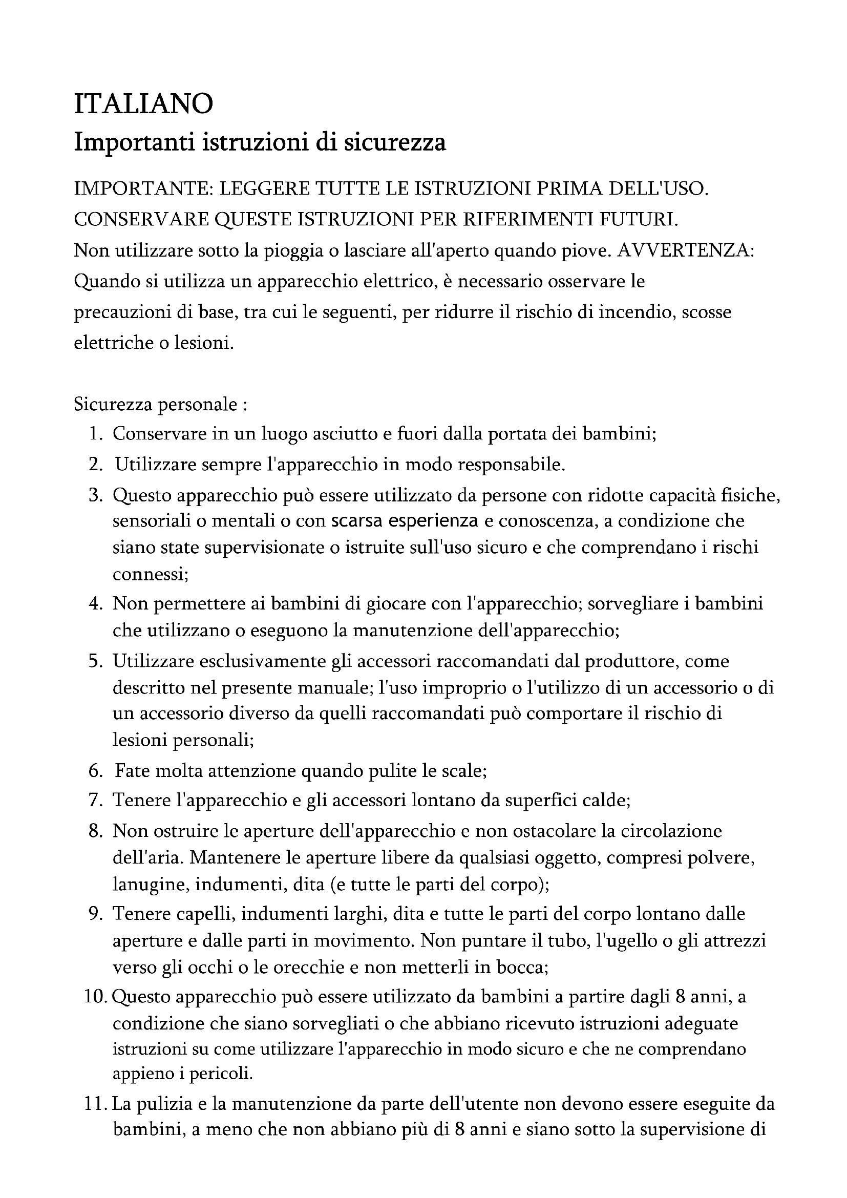 11. La pulizia e la manutenzione da parte dell'utente non devono essere eseguite da
