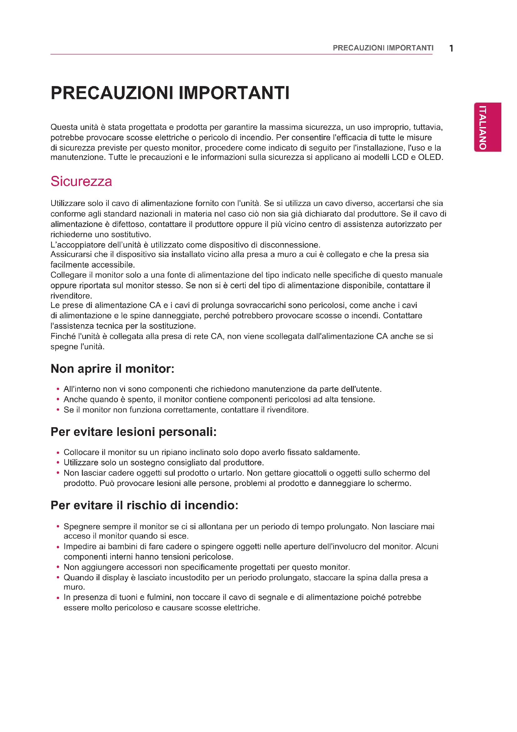 ÁGUA air BAHAN KIMIA1 ENG ITALIANOPRECAUZIONI IMPORTANTI PRECAUZIONI IMPORTANTI Questa unità è stata progettata e prodotta per garantire la massima sicurezza, un uso improprio, tuttavia, potrebbe provocare scosse elettriche o pericolo di incendio. Per consentire l'efficacia di tutte le misure di sicurezza previste per questo monitor, procedere come indicato di seguito per l'installazione, l'uso e la manutenzione. Tutte le precauzioni e le informazioni sulla sicurezza si applicano ai modelli LCD e OLED. Sicurezza Utilizzare solo il cavo di alimentazione fornito con l'unità. Se si utilizza un cavo diverso, accertarsi che sia conforme agli standard nazionali in materia nel caso ciò non sia già dichiarato dal produttore. Se il cavo di alimentazione è difettoso, contattare il produttore oppure il più vicino centro di assistenza autorizzato perrichiederne uno sostitutivo.L’accoppiatore dell’unità è utilizzato come dispositivo di disconnessione.Assicurarsi che il dispositivo sia installato vicino alla presa a muro a cui è collegato e che la presa sia facilmente accessibile.Collegare il monitor solo a una fonte di alimentazione del tipo indicato nelle specifiche di questo manuale oppure riportata sul monitor stesso. Se non si è certi del tipo di alimentazione disponibile, contattare il rivenditore.Le prese di alimentazione CA e i cavi di prolunga sovraccarichi sono pericolosi, come anche i cavi di alimentazione e le spine danneggiate, perché potrebbero provocare scosse o incendi. Contattare l'assistenza tecnica per la sostituzione.Finché l'unità è collegata alla presa di rete CA, non viene scollegata dall'alimentazione CA anche se si spegne l'unità. Non aprire il monitor:
