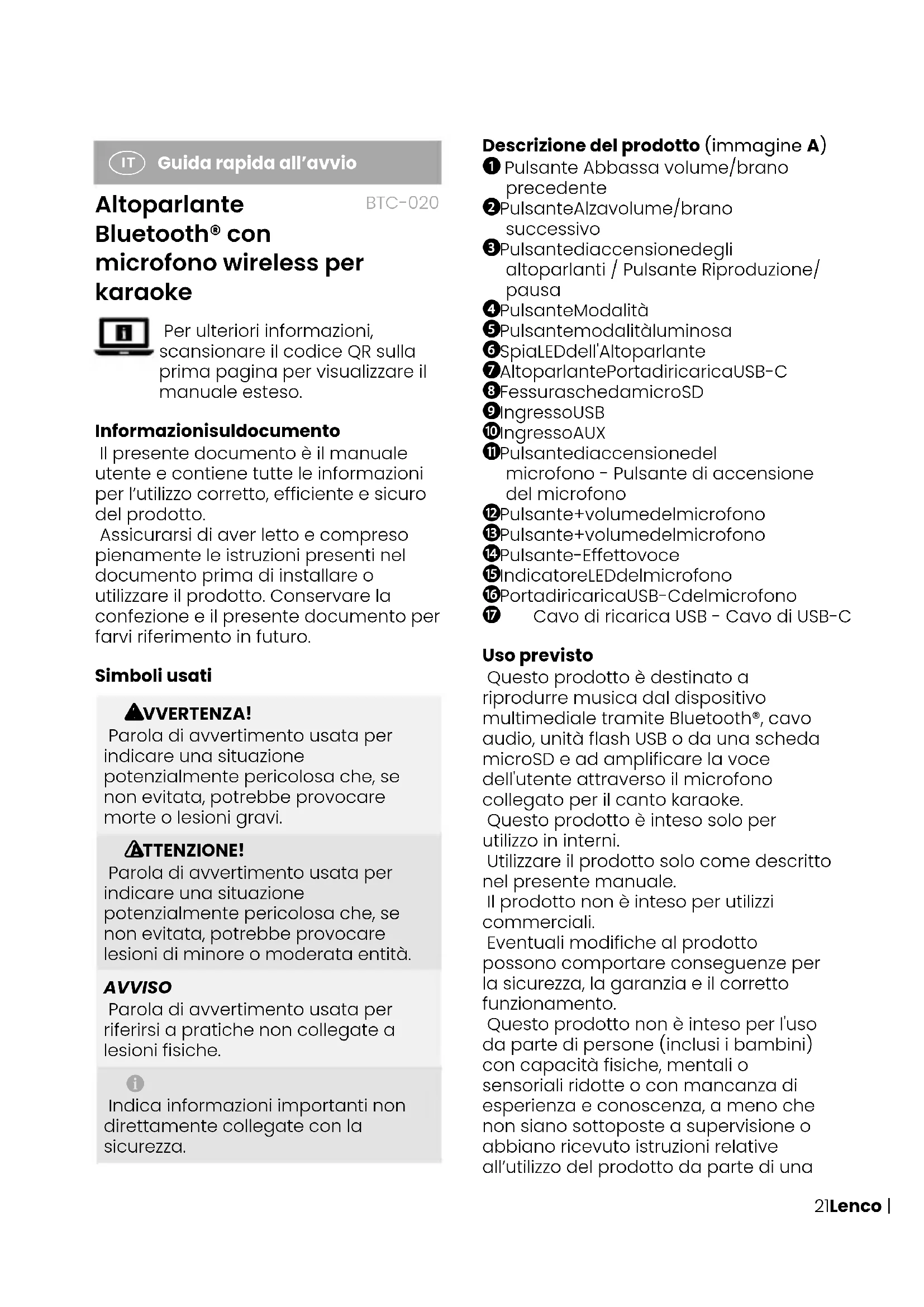 Guida rapida all’avvio Altoparlante Bluetooth® con microfono wireless per karaoke BTC-020 Per ulteriori informazioni, scansionare il codice QR sulla prima pagina per visualizzare il manuale esteso. Informazioni sul documento Il presente documento è il manuale utente e contiene tutte le informazioni per l’utilizzo corretto, efficiente e sicuro del prodotto. Assicurarsi di aver letto e compreso pienamente le istruzioni presenti nel documento prima di installare o utilizzare il prodotto. Conservare la confezione e il presente documento per farvi riferimento in futuro. Simboli usati
