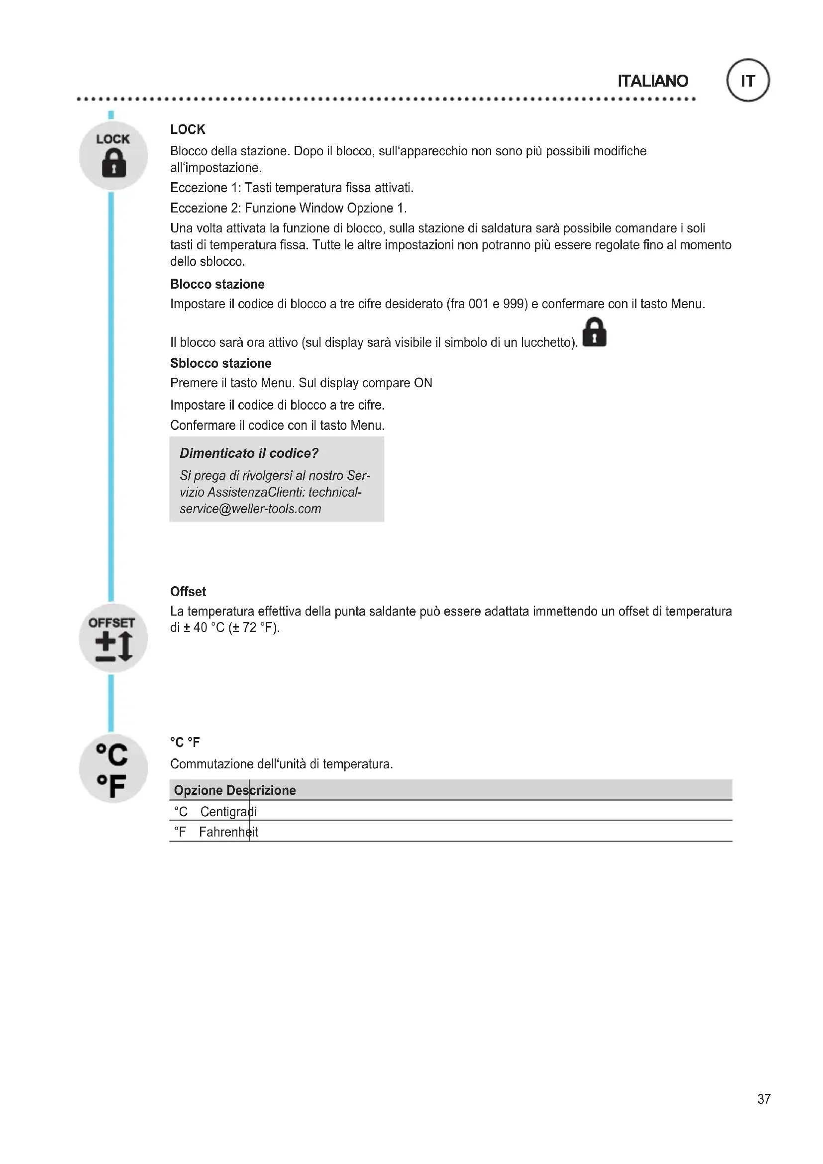 ITALIANO37 LOCK Bloccodellastazione.Dopoilblocco,sull‘apparecchiononsonopiùpossibilimodiche all‘impostazione. Eccezione1:Tastitemperaturassaattivati. Eccezione2:FunzioneWindowOpzione1. Unavoltaattivatalafunzionediblocco,sullastazionedisaldaturasaràpossibilecomandareisoli tastiditemperaturassa.Tuttelealtreimpostazioninonpotrannopiùessereregolatenoalmomento dellosblocco. Blocco stazione Impostareilcodicedibloccoatrecifredesiderato(fra001e999)econfermareconiltastoMenu. Ilbloccosaràoraattivo(suldisplaysaràvisibileilsimbolodiunlucchetto). Sblocco stazione PremereiltastoMenu.SuldisplaycompareON Impostareilcodicedibloccoatrecifre. ConfermareilcodiceconiltastoMenu. Dimenticato il codice? Si prega di rivolgersi al nostro Ser- vizio AssistenzaClienti: technical- service@weller-tools.com Offset Latemperaturaeffettivadellapuntasaldantepuòessereadattataimmettendounoffsetditemperatura di±40°C(±72°F). °C °F Commutazionedell‘unitàditemperatura. Opzione Descrizione °C Centigradi °F Fahrenheit