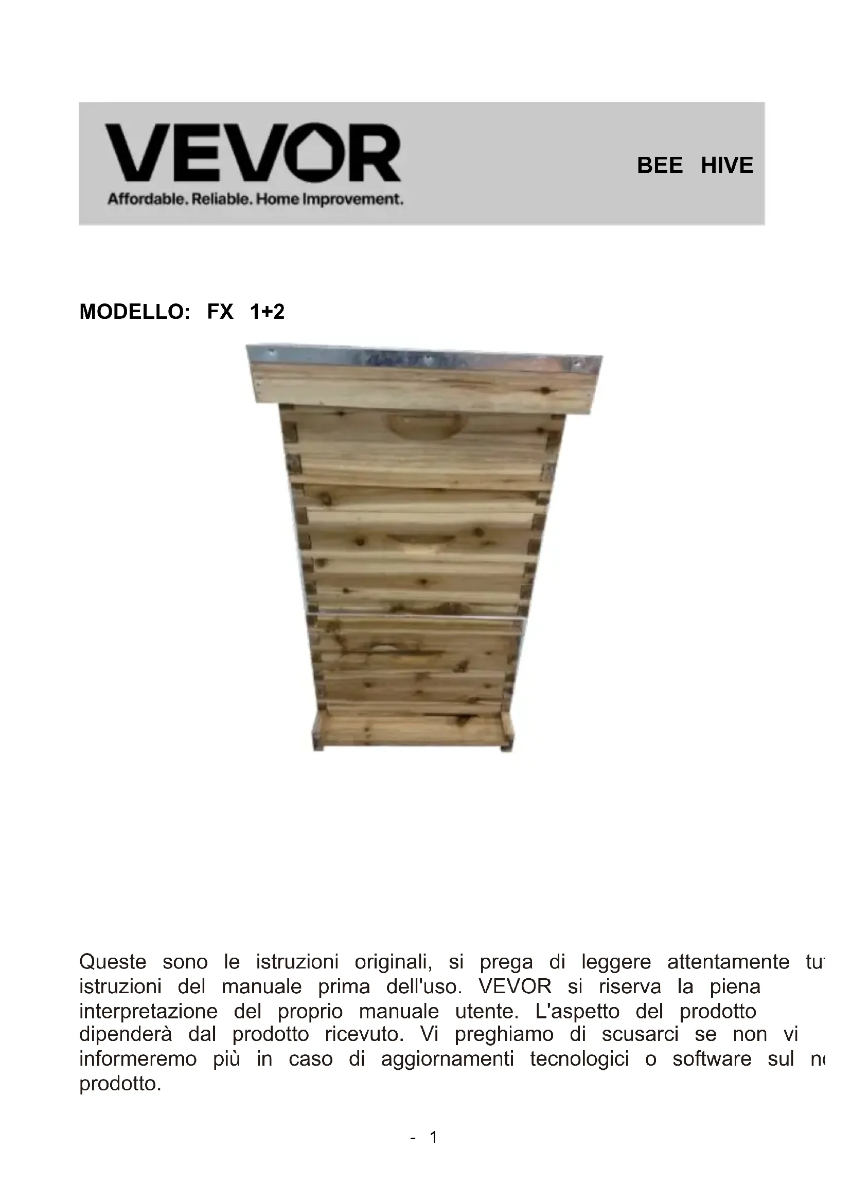 MODELLO: FX 1+2 Queste sono le istruzioni originali, si prega di leggere attentamente tutte le istruzioni del manuale prima dell'uso. VEVOR si riserva la piena interpretazione del proprio manuale utente. L'aspetto del prodotto dipenderà dal prodotto ricevuto. Vi preghiamo di scusarci se non vi informeremo più in caso di aggiornamenti tecnologici o software sul nostro prodotto. BEE HIVE- 2 - Avvertenza: per ridurre il rischio di lesioni, l'utente deve leggere attentamente il manuale di istruzioni. INSTALLATION NOTES NOTE :