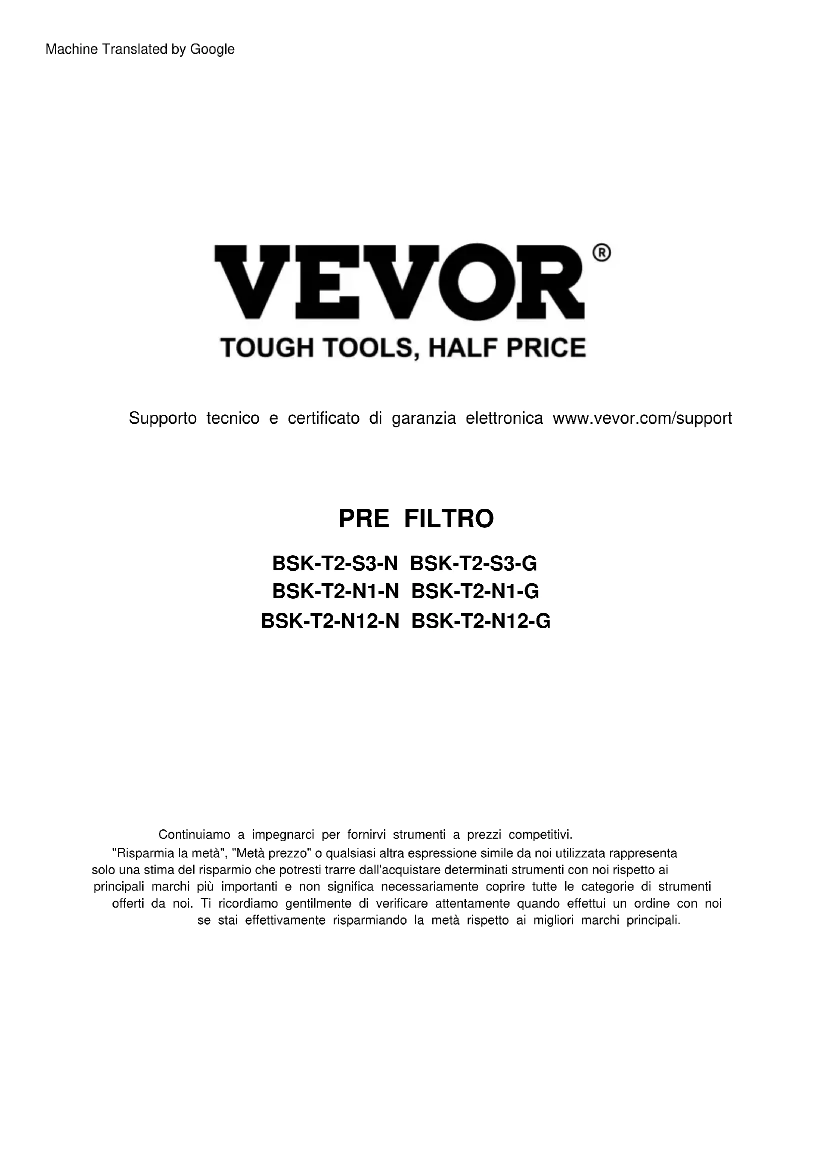 "Risparmia la metà", "Metà prezzo" o qualsiasi altra espressione simile da noi utilizzata rappresenta solo una stima del risparmio che potresti trarre dall'acquistare determinati strumenti con noi rispetto ai principali marchi più importanti e non significa necessariamente coprire tutte le categorie di strumenti offerti da noi. Ti ricordiamo gentilmente di verificare attentamente quando effettui un ordine con noi se stai effettivamente risparmiando la metà rispetto ai migliori marchi principali. Continuiamo a impegnarci per fornirvi strumenti a prezzi competitivi. PRE FILTRO Supporto tecnico e certificato di garanzia elettronica www.vevor.com/support Machine Translated by GoogleHai domande sul prodotto? Hai bisogno di supporto tecnico? Non esitate a contattarci: Supporto tecnico e certificato di garanzia elettronica www.vevor.com/ support Queste sono le istruzioni originali, leggere attentamente tutte le istruzioni del manuale prima dell'uso. VEVOR si riserva una chiara interpretazione del nostro manuale d'uso. L'aspetto del prodotto sarà soggetto al prodotto ricevuto. Ti preghiamo di perdonarci se non ti informeremo più se sono presenti aggiornamenti tecnologici o software sul nostro prodotto.