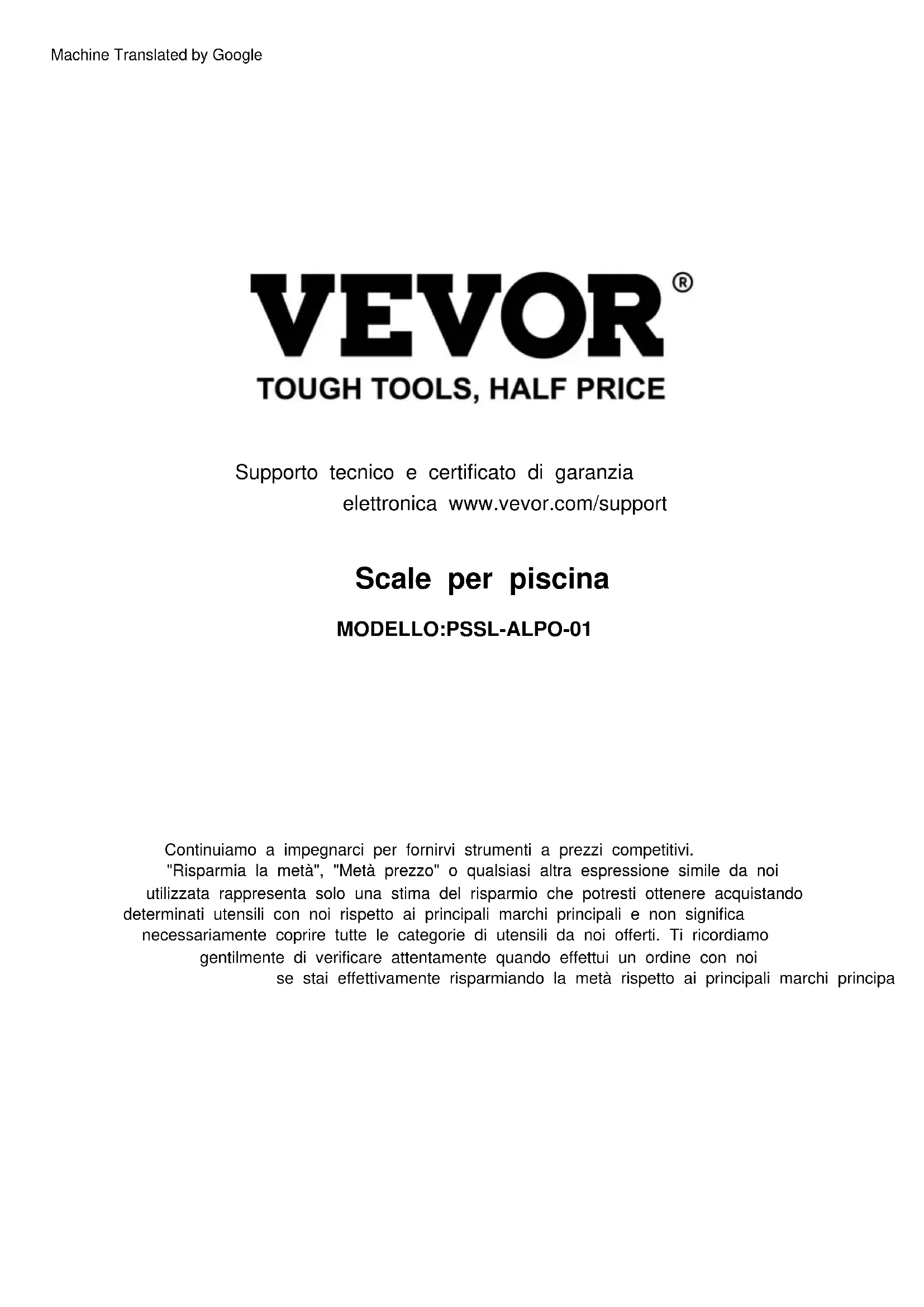 Machine Translated by GoogleTechnischer Support und E-Garantie-Zertifikat www.vevor.com/support Machine Translated by GoogleScale per piscina Supporto tecnico e certificato di garanzia elettronica www.vevor.com/support MODELLO:PSSL-ALPO-01 "Risparmia la metà", "Metà prezzo" o qualsiasi altra espressione simile da noi utilizzata rappresenta solo una stima del risparmio che potresti ottenere acquistando determinati utensili con noi rispetto ai principali marchi principali e non significa necessariamente coprire tutte le categorie di utensili da noi offerti. Ti ricordiamo gentilmente di verificare attentamente quando effettui un ordine con noi se stai effettivamente risparmiando la metà rispetto ai principali marchi principali. Continuiamo a impegnarci per fornirvi strumenti a prezzi competitivi. Machine Translated by GoogleHAI BISOGNO DI AIUTO? CONTATTACI!