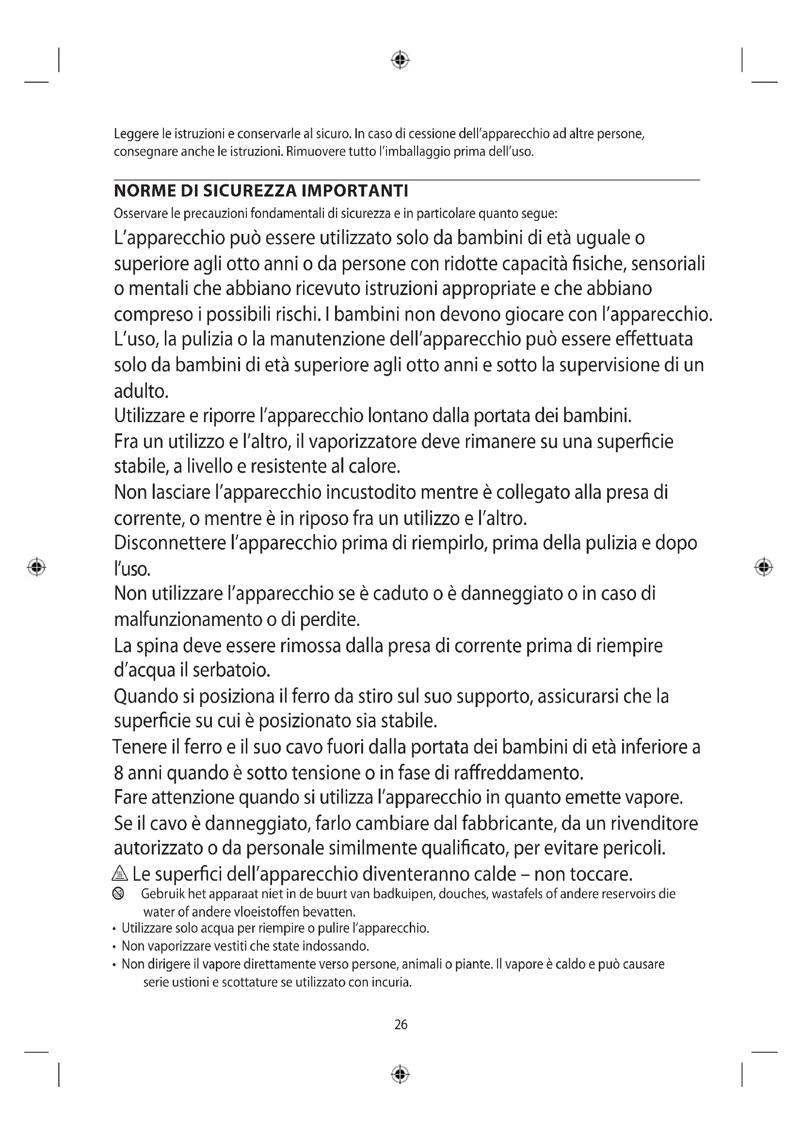 Osservare le precauzioni fondamentali di sicurezza e in particolare quanto segue: L’apparecchio può essere utilizzato solo da bambini di età uguale o superiore agli otto anni o da persone con ridotte capacità fisiche, sensoriali o mentali che abbiano ricevuto istruzioni appropriate e che abbiano compreso i possibili rischi. I bambini non devono giocare con l’apparecchio. L’uso, la pulizia o la manutenzione dell’apparecchio può essere effettuata solo da bambini di età superiore agli otto anni e sotto la supervisione di un adulto. Utilizzare e riporre l’apparecchio lontano dalla portata dei bambini. Fra un utilizzo e l’altro, il vaporizzatore deve rimanere su una superficie stabile, a livello e resistente al calore. Non lasciare l’apparecchio incustodito mentre è collegato alla presa di corrente, o mentre è in riposo fra un utilizzo e l’altro. Disconnettere l’apparecchio prima di riempirlo, prima della pulizia e dopo l’uso. Non utilizzare l’apparecchio se è caduto o è danneggiato o in caso di malfunzionamento o di perdite. La spina deve essere rimossa dalla presa di corrente prima di riempire d’acqua il serbatoio. Quando si posiziona il ferro da stiro sul suo supporto, assicurarsi che la superficie su cui è posizionato sia stabile. Tenere il ferro e il suo cavo fuori dalla portata dei bambini di età inferiore a 8 anni quando è sotto tensione o in fase di raffreddamento. Fare attenzione quando si utilizza l’apparecchio in quanto emette vapore. Se il cavo è danneggiato, farlo cambiare dal fabbricante, da un rivenditore autorizzato o da personale similmente qualificato, per evitare pericoli. h Le superfici dell’apparecchio diventeranno calde – non toccare. b Gebruik het apparaat niet in de buurt van badkuipen, douches, wastafels of andere reservoirs die water of andere vloeistoffen bevatten.