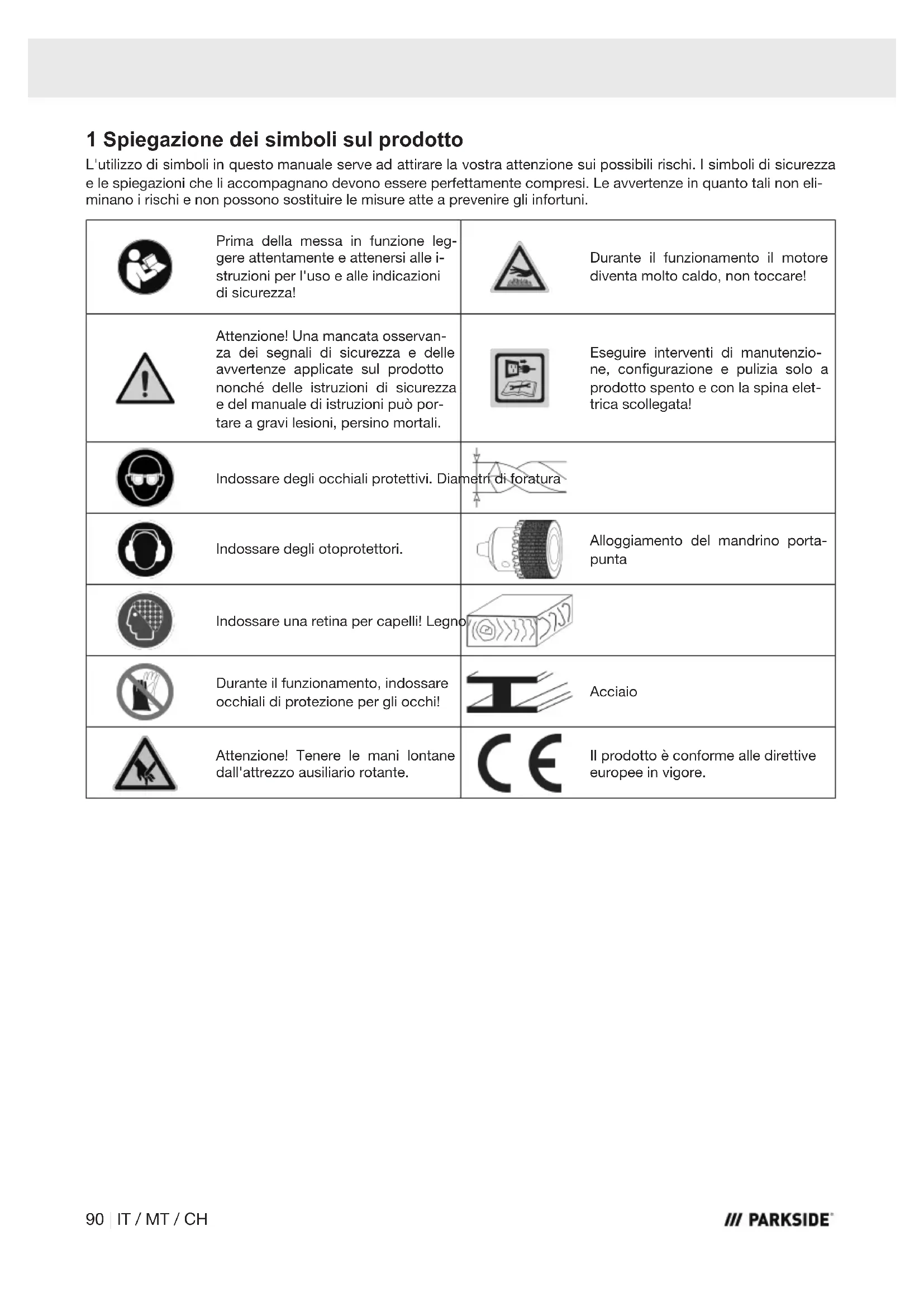 A. 1 x Chiave a brugola 4 mm B. 1 x Chiave a brugola 5 mm 1 x Trapano da tavolo 1 x Istruzioni per l'uso 5 Impiego conforme alla destinazione d'uso Il trapano da banco è adatto alla perforazione di metal- lo, legno, plastica e piastrelle. Si possono utilizzare tra- pani con codolo dai 1,5 ai 13 mm di diametro di foratu- ra. È consentito impiegare il prodotto solo conformemente alla sua destinazione d'uso. Qualsiasi ulteriore impiego che esuli dalla suddetta finalità non è conforme alla de- stinazione d'uso. L'utente/l'operatore, e non il produt- tore, è unico responsabile dei danni o di qualsiasi tipo di lesione derivante. L'osservanza delle indicazioni di sicurezza, nonché il ri- spetto delle istruzioni di montaggio e delle indicazioni operative contenute nelle istruzioni per l'uso sono fon- damentali al fine di un utilizzo del dispositivo conforme alla destinazione d'uso. Il personale addetto all'uso e alla manutenzione del prodotto deve possedere una certa dimestichezza con lo stesso ed essere al corrente dei possibili pericoli. Modifiche al prodotto escludono completamente la re- sponsabilità del produttore per i danni che ne derivano. Il prodotto può essere utilizzato soltanto con compo- nenti e accessori originali del produttore. Le disposizioni relative alla sicurezza, al lavoro e alla manutenzione del produttore e le misure indicate nei Dati tecnici devono essere rispettate. Si prega di osservare che i nostri prodotti non sono de- stinati a un uso commerciale, artigianale o industriale. Si declina ogni responsabilità qualora il prodotto venga impiegato nel quadro di un'attività commerciale, arti- gianale, industriale o simili. Spiegazione delle parole di segnalazione nelle istruzioni per l'uso PERICOLO Dicitura di segnalazione indicante la pre- senza di una situazione imminente di peri- colo che, se non viene evitata, porta alla morte o a gravi lesioni. AVVISO Dicitura di segnalazione indicante una pos- sibile situazione di pericolo che, se non vie- ne evitata, può portare alla morte o a gravi lesioni. CAUTELA Dicitura di segnalazione indicante una pos- sibile situazione di pericolo che, se non vie- ne evitata, può comportare lesioni di lieve o media entità. ATTENZIONE Dicitura di segnalazione indicante una pos- sibile situazione di pericolo che, se non vie- ne evitata, potrebbe comportare danni ma- teriali al prodotto o proprietà. 6 Indicazioni di sicurezza Indicazioni generali di sicurezza per gli attrezzi elettrici Conservare tutte le indicazioni di sicurezza e le istruzioni per ulteriore consultazione. Il termine "attrezzo elettrico" utilizzato nelle indicazioni di sicurezza si riferisce ad attrezzi elettrici alimentati dalla rete (con cavo di rete) e ad attrezzi elettrici funzio- nanti a batteria (senza cavo di rete). AVVISO Leggere tutte le indicazioni di sicurezza, le istruzioni, le illustrazioni e i dati tecnici dei quali è dotato questo attrezzo elettrico. L'inosservanza delle seguenti istruzioni può provoca- re scosse elettriche, incendi e/o lesioni gravi. 92 | IT / MT / CH1) Sicurezza sul posto di lavoro a) Tenere la zona di lavoro pulita e ben illuminata. Zone di lavoro disordinate e non illuminate potreb- bero provocare infortuni. b) Non lavorare con l’attrezzo elettrico in aree a ri- schio di esplosione, nelle quali si trovino fluidi, gas o polveri infiammabili. Gli attrezzi elettrici ge- nerano scintille che possono infiammare la polvere o i vapori. c) Tenere i bambini e le altre persone distanti du- rante l'utilizzo dell’attrezzo elettrico. In caso di deviazione, si potrebbe perdere il controllo dell’at- trezzo elettrico.