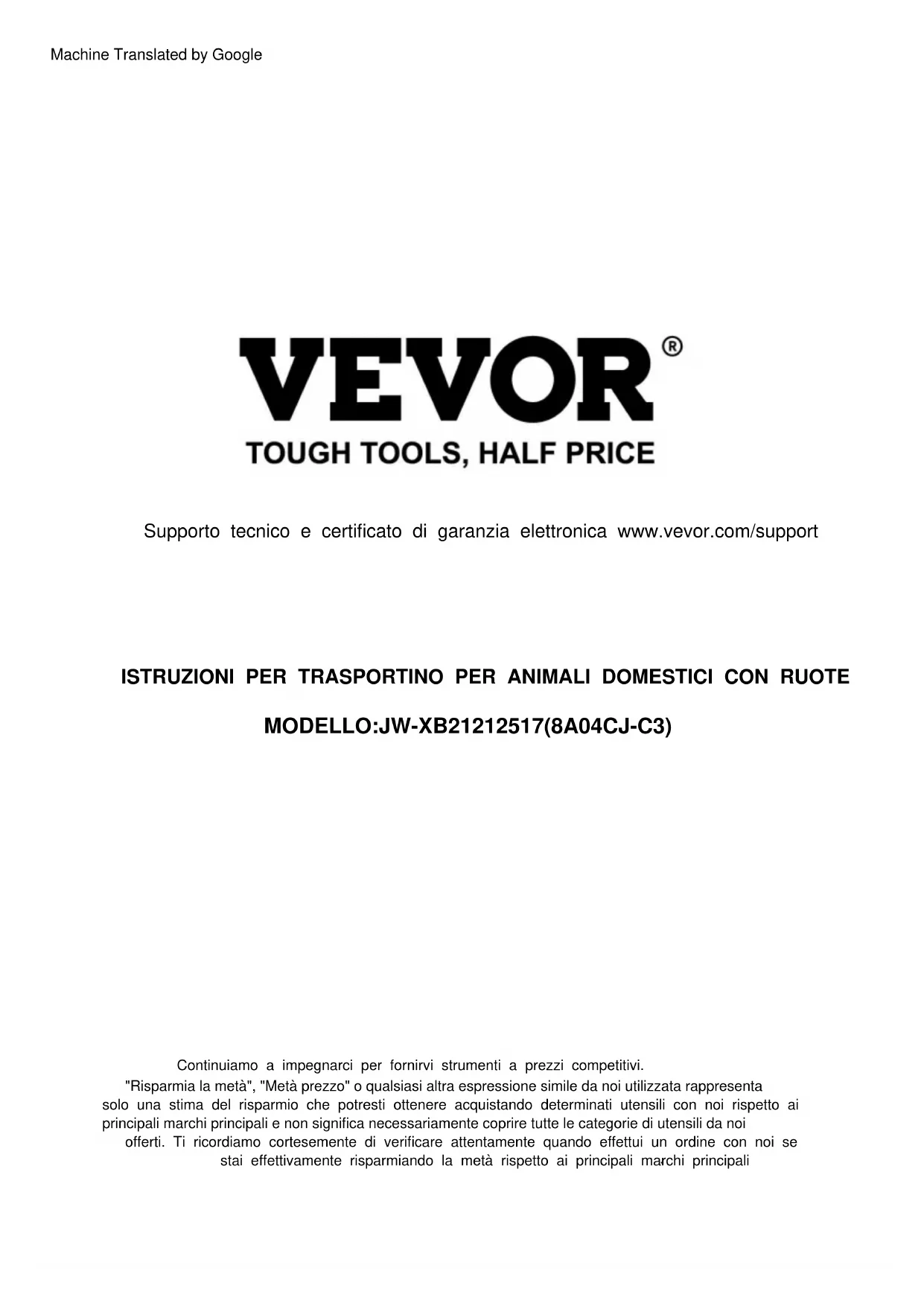 ISTRUZIONI PER TRASPORTINO PER ANIMALI DOMESTICI CON RUOTE Supporto tecnico e certificato di garanzia elettronica www.vevor.com/support Machine Translated by GoogleSupporto tecnico e certificato di garanzia elettronica www.vevor.com/support Hai domande sui prodotti? Hai bisogno di supporto tecnico? Non esitare a contattarci: Questa è l'istruzione originale, si prega di leggere attentamente tutte le istruzioni del manuale prima di utilizzare. VEVOR si riserva una chiara interpretazione del nostro manuale utente. L'aspetto del prodotto sarà soggetto al prodotto ricevuto. Vi preghiamo di perdonarci se non vi informeremo di nuovo se ci sono aggiornamenti tecnologici o software sul nostro prodotto.