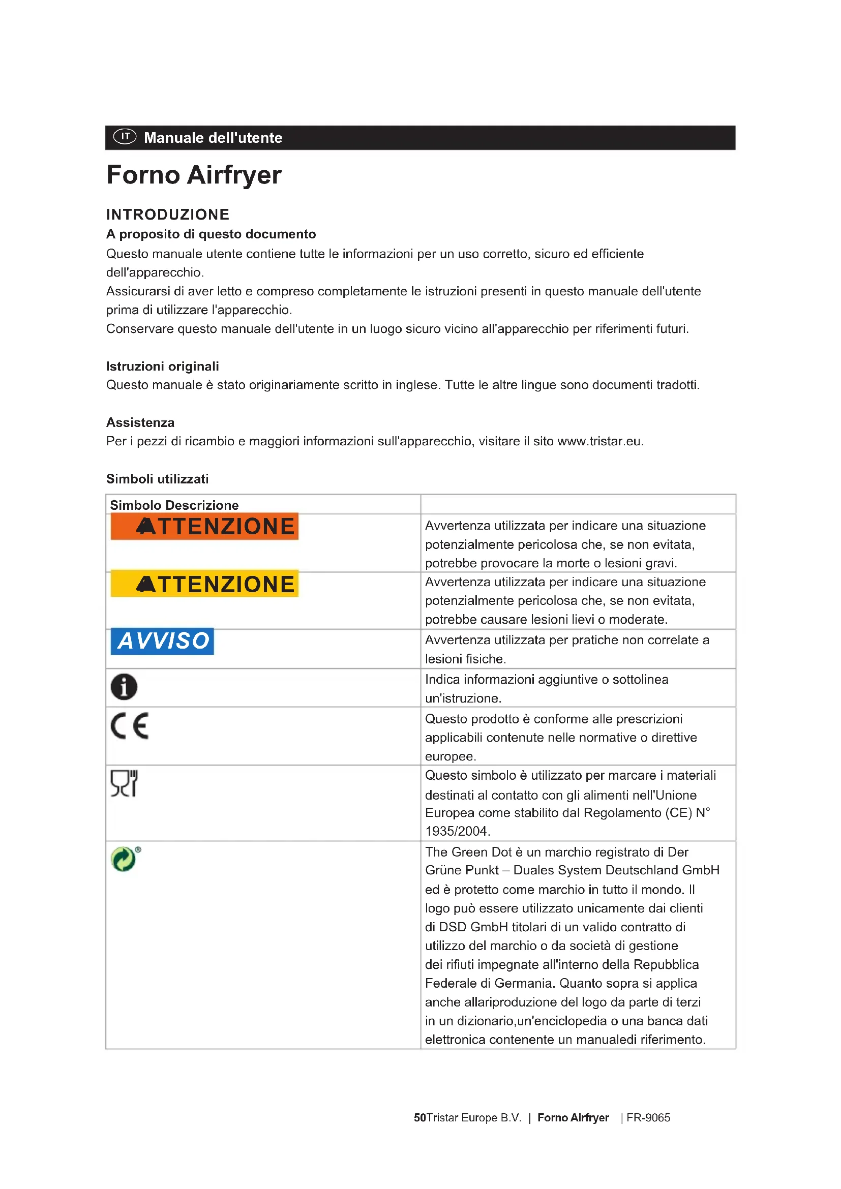 ATTENZIONE Avvertenza utilizzata per indicare una situazione potenzialmente pericolosa che, se non evitata, potrebbe causare lesioni lievi o moderate. AVVISO Avvertenza utilizzata per pratiche non correlate a lesioni siche. Indica informazioni aggiuntive o sottolinea un'istruzione. Questo prodotto è conforme alle prescrizioni applicabili contenute nelle normative o direttive europee. Questo simbolo è utilizzato per marcare i materiali destinati al contatto con gli alimenti nell'Unione Europea come stabilito dal Regolamento (CE) N° 1935/2004. The Green Dot è un marchio registrato di Der Grüne Punkt – Duales System Deutschland GmbH ed è protetto come marchio in tutto il mondo. Il logo può essere utilizzato unicamente dai clienti di DSD GmbH titolari di un valido contratto di utilizzo del marchio o da società di gestione dei riuti impegnate all'interno della Repubblica Federale di Germania. Quanto sopra si applica anche allariproduzione del logo da parte di terzi in un dizionario,un'enciclopedia o una banca dati elettronica contenente un manualedi riferimento.51Manuale dell'utente Il simbolo, il logo o l'icona del riciclaggio universale è un emblema riconosciuto a livello internazionale utilizzato per designare i materiali riciclabili. Il simbolo del riciclaggio è di dominio pubblico e non è un marchio. Applicabile in Francia: Il prodotto o l'imballaggio possono essere riciclati e i componenti devono essere smaltiti separatamente. Seguire le normative locali. Applicabile in Italia: Il prodotto o l'imballaggio possono essere riciclati e i componenti devono essere smaltiti separatamente. Seguire le normative locali. I riuti elettrici non vanno smaltiti insieme ai riutidomestici. Provvedere al riciclo dove esistono strutture. Eettuare laverica presso l'autorità locale o il negozio in loco per ottenereconsigli sul riciclaggio. DESCRIZIONE DELL'APPARECCHIO A proposito dell'apparecchio La Tristar FR-9065 è una friggitrice ad aria per grigliare, cuocere e arrostire gli alimenti utilizzando l'aria calda con un uso minimo o nullo di olio. Uso previsto Questo apparecchio è destinato esclusivamente all'uso interno. Questo apparecchio è destinato esclusivamente a un uso domestico e non commerciale. Questo apparecchio è destinato all'uso in applicazioni domestiche e simili come: - cucine per il personale in negozi, uffici e altri ambienti di lavoro; - case coloniche; - da clienti in hotel, motel e altri ambienti di tipo residenziale; - ambienti tipo bed and breakfast. Questo apparecchio non è destinato all'uso da parte di persone (compresi i bambini) con ridotte capacità fisiche, sensoriali o mentali o prive di esperienza e conoscenza, a meno che non siano state supervisionate o istruite sull'uso dell'apparecchio da una persona responsabile della loro sicurezza. L'apparecchio non deve essere utilizzato da bambini di età inferiore agli 8 anni. L'apparecchio può essere utilizzato da bambini di almeno 8 anni e da persone con ridotte capacità fisiche, sensoriali o mentali oppure senza la necessaria pratica ed esperienza sotto la supervisione di un adulto o dopo aver ricevuto adeguate istruzioni sull'uso in sicurezza dell'apparecchio e aver compreso i possibili rischi. I bambini non devono giocare con l'apparecchio. Mantenere l'apparecchio e il relativo cavo fuori dalla portata dei bambini di età inferiore agli 8 anni. I bambini non devono eseguire interventi di manutenzione e pulizia almeno che non abbiano più di 8 anni e non siano controllati. L'apparecchio non è progettato per essere azionato tramite un timer esterno o un sistema di telecomando separato. Qualsiasi uso dell'apparecchio diverso da quello descritto in questo manuale dell'utente è considerato un uso improprio e può causare lesioni o danni all'apparecchio e invalidare la garanzia. Speciche tecniche Nome dell'apparecchio Forno Airfryer52Tristar Europe B.V. | Forno Airfryer | FR-9065 Numero dell'articolo FR-9065 Alimentazione 220 - 240 V ~ 50/60 Hz Consumo di energia in uso 1600 - 1800 W Parti principali (vedi immagine A)