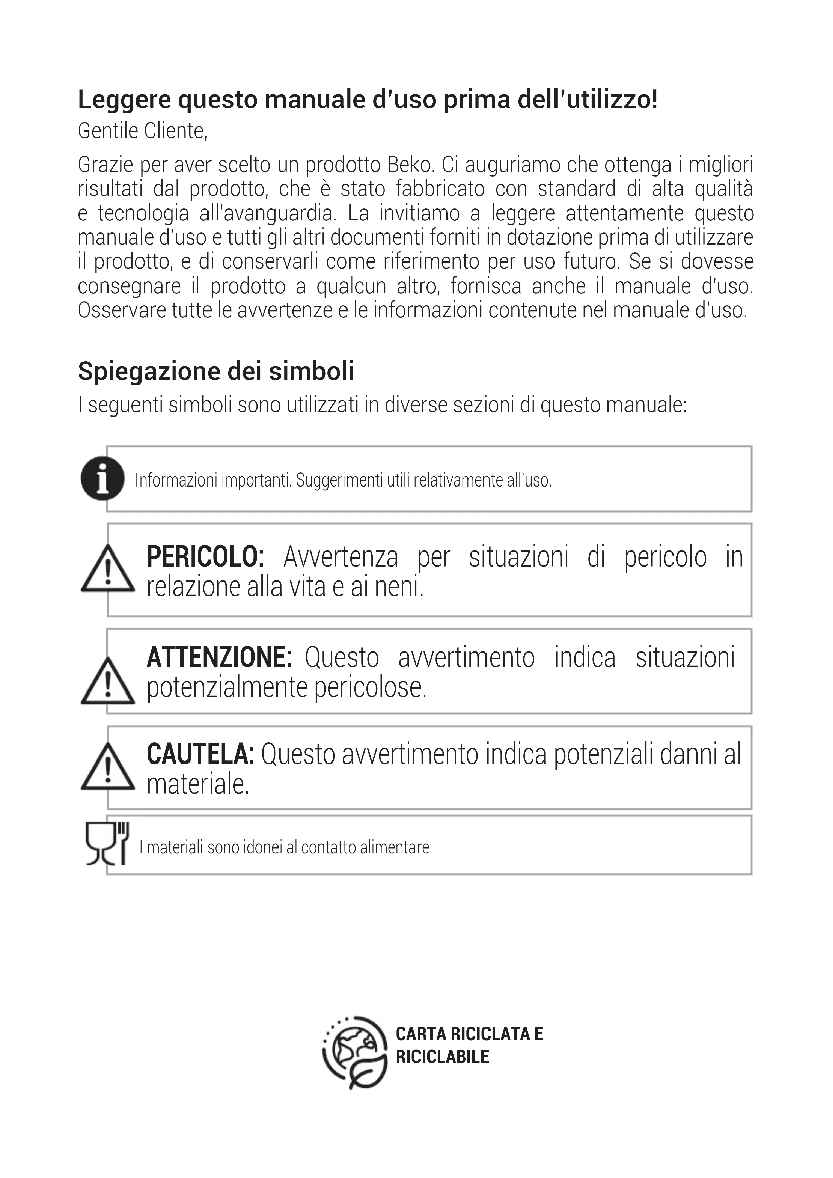 incuria e negligenza (ad esempio, mancata pulizia batterie condensanti, fori di drenaggio, filtri di scarico e filtri di entrata acqua, mancata eliminazione corpi estranei, insufficiente pulizia dei piani di cottura, ecc.) e in generale tutte le circostanze esterne che non siano riconducibili a difetti di fabbricazione del prodotto. Beko si riserva la facoltà di addebitare all’utente il costo dell’intervento di assistenza nei casi in cui non sia stato riscontrato il difetto lamentato dall’utente, o nei casi di generici problemi di funzionamento correlati a errata impressione dell’utente (problemi di asciugatura, rumorosità, difetti di lavaggio, eccessiva formazione di schiuma, nonché problemi di centrifuga, di raffreddamento, di riscaldamento, ecc.). Nei casi sopra citati in cui la garanzia non è operativa, si intendono a pagamento anche tutti gli eventuali trasporti necessari per lo svolgimento degli interventi di assistenza. Il Servizio Assistenza di BEKO è l’unico autorizzato a riparare i prodotti a marchio BEKO sulla base della presente garanzia convenzionale. Durante e dopo il periodo di garanzia, vi consigliamo di rivolgervi sempre ai nostri centri di assistenza autorizzati. Per contattare il Centro di Assistenza Tecnica Autorizzato operante nella vostra zona chiamate il numero unico per l’Italia: