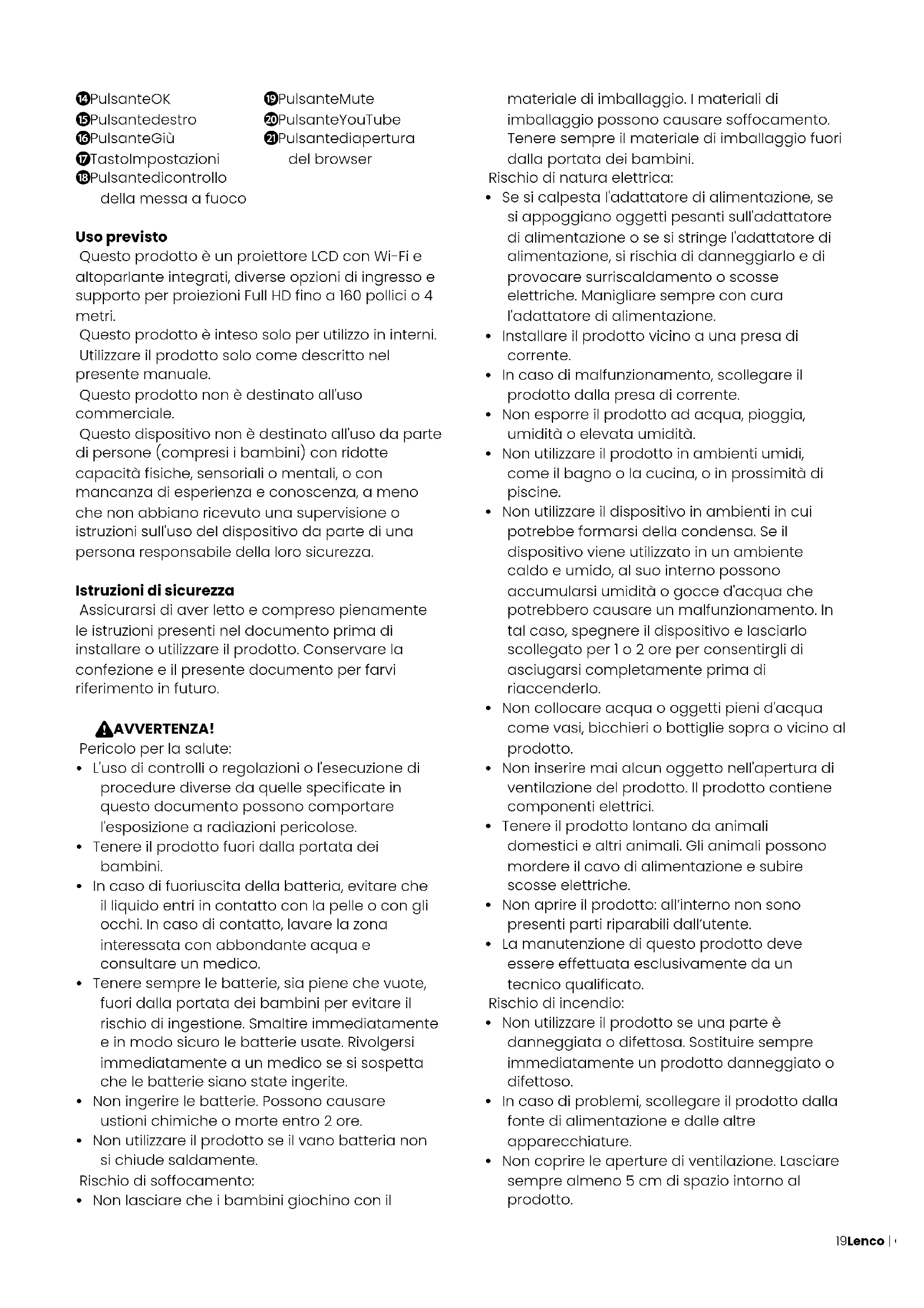Pulsante di apertura del browser Uso previsto Questo prodotto è un proiettore LCD con Wi-Fi e altoparlante integrati, diverse opzioni di ingresso e supporto per proiezioni Full HD fino a 160 pollici o 4 metri. Questo prodotto è inteso solo per utilizzo in interni. Utilizzare il prodotto solo come descritto nel presente manuale. Questo prodotto non è destinato all'uso commerciale. Questo dispositivo non è destinato all'uso da parte di persone (compresi i bambini) con ridotte capacità fisiche, sensoriali o mentali, o con mancanza di esperienza e conoscenza, a meno che non abbiano ricevuto una supervisione o istruzioni sull'uso del dispositivo da parte di una persona responsabile della loro sicurezza. Istruzioni di sicurezza Assicurarsi di aver letto e compreso pienamente le istruzioni presenti nel documento prima di installare o utilizzare il prodotto. Conservare la confezione e il presente documento per farvi riferimento in futuro. 6 AVVERTENZA! Pericolo per la salute: