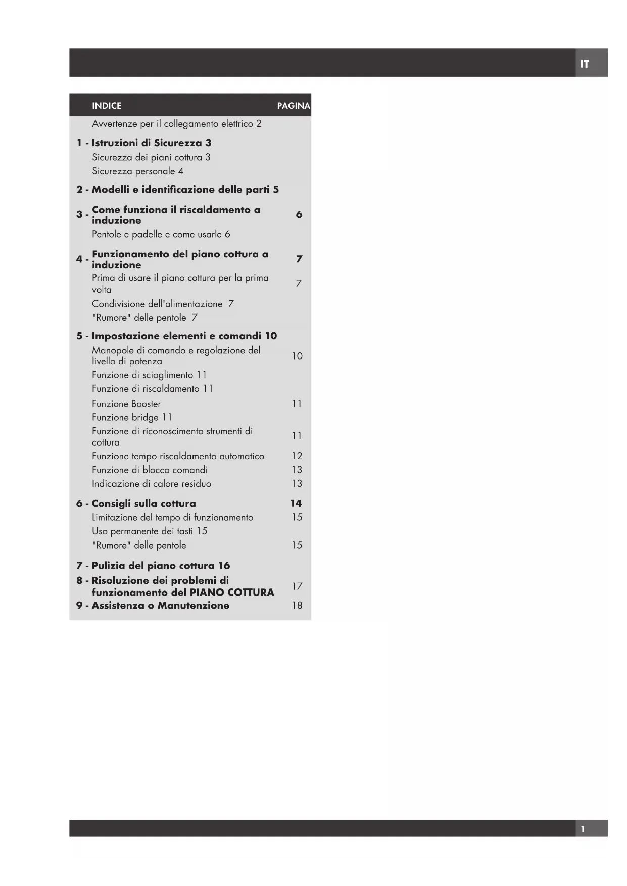 Come funziona il riscaldamento a INDUZIONE Vi è un circuito elettronico all'interno del piano di cottura ad induzione che alimenta e comanda una bobina. Ciò crea un campo magnetico che si attiva quando viene a contatto con le pentole e le padelle (materiale magnetico) adeguate. La padella sul fornello si riscalda istantaneamente, mentre il piano di cottura rimane freddo. Non vi è alcuna perdita di calore. Il calore generato nella pentola consente di cucinare in modo rapido, risparmiando tempo e energia. Piastra ad induzione Campo magnetico Riscaldamento della pentola Pentola in materiale magneticoCon la pentola si attiva la zona di cotturaSenza pentola la zona cottura non si attiva Pentole e padelle e come usarle ATTENZIONE All'interno del piano cottura a induzione è presente un circuito elettronico realizzato in materiale ferromagnetico. Si può usare pentole in acciaio smaltato, ghisa o pentole speciali di acciaio inossidabile per induzione. Per assicurarsi che una pentola è adatta, provare a utilizzare una calamita per vedere se si attacca al fondo della padella. Non utilizzare mai acciaio sottile normale né tutto ciò che contiene anche solo una piccola quantità di vetro, terracotta, rame o alluminio. Il display della zona di cottura mostrerà se la pentola è adatta; se l'indicatore di alimentazione lampeggia la pentola non è adatta o il diametro del fondo è troppo piccolo per il diametro della zona di cottura. Le pentole e i tegami devono essere posizionati proprio al centro della zona di cottura. In alcune zone di cottura, è indicato diametro interno, con un leggero contorno.IT