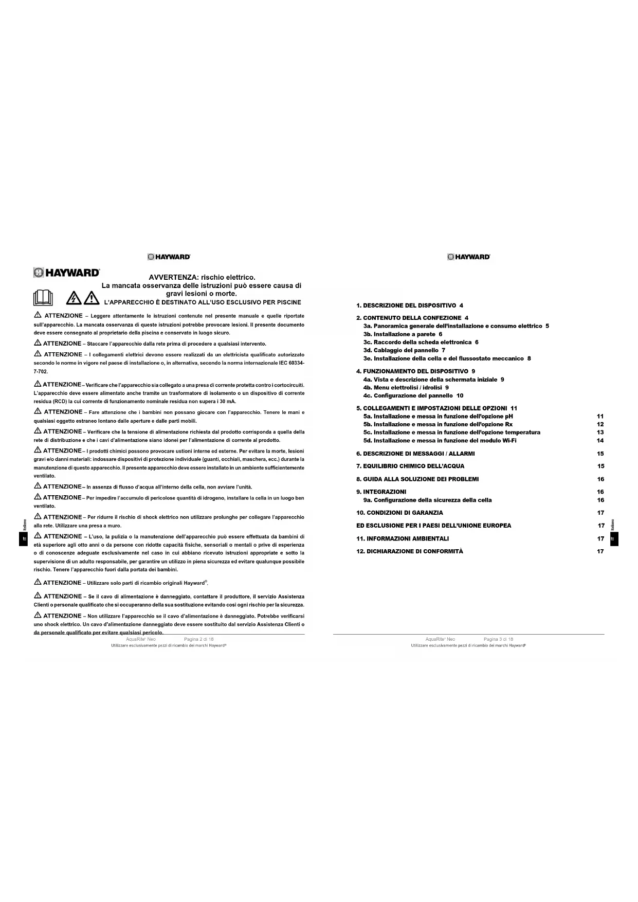 non è da ritenersi responsabile per qualsiasi danno, diretto o indiretto, derivante da un’installazione non corretta, da collegamenti erronei o da un uso improprio del prodotto. Per usufruire della presente garanzia e richiedere un intervento di riparazione o sostituzione di un articolo, contattare il proprio rivenditore. Nessun prodotto può essere rinviato direttamente in fabbrica senza la nostra preliminare autorizzazione. Le parti usurabili non sono coperte da garanzia. I pezzi soggetti a usura dell’elettrolizzatore al sale indicati qui di seguito devono essere sottoposti a manutenzione in funzione della loro durata di vita stimata: - Cella in titanio: 8.000 ore - Set di giunti (cella in titanio, supporto di sonda): 2 anni - Tubo in Santoprene (pompa peristaltica) - Membrana (pompa elettromagnetica): 2 anni - Sonda (pH, Rx, conduttività, cloro libero): 1 anno (garanzia 6 mesi) Disposizioni relative ai riuti di apparecchiature elettriche ed elettroniche dei professionisti. In conformità con la direttiva 2012/19/UE relativa alla gestione dei riuti di apparecchiature elettriche ed elettroniche, questo panello deve essere smaltito in un punto di raccolta differenziata. ==> per maggior informazioni contattare il distributore. La corretta gestione delle apparecchiature elettriche ed elettroniche contribuisce a prevenire i danni all’ambiente e alla salute dell’uomo. In conformità al Regolamento (UE) 2023/1542 del Parlamento europeo e del Consiglio, del 12 luglio 2023, relativo a pile e accumulatori e ai riuti di pile e accumulatori, che modica la direttiva 2008/98/CE e il regolamento (UE) 2019/2020 e che abroga la direttiva 2006/66/CE, il simbolo che accompagna questo manuale informa che la pila montata nel panello va obbligatoriamente smaltita nel rispetto delle norme sulla raccolta differenziata. Quando la pila arriva a ne vita, dovrà essere rimossa e portata in un punto di raccolta differenziata. Alla pagina precedente viene indicato come procedere per la sostituzione della pila. Questo prodotto è conforme ai seguenti standard: - Direttiva LVD 2014/35/UE, IEC 60335-1:2020, EN IEC 60335-1:2023+A11:2023, EN 62233:2008 + IPX4, - Direttiva ECM 2014/30/UE, EN IEC55014-1:2021, EN IEC 55014-2:2021, EN IEC 61000-3-2:2019+A1:2021, EN 61000-3-3:2013+A1:2019+A2:2021+AC:2022-01. - RoHS 2011/65/UE - Emendamento (UE) 2015/863, Regolamento (UE) 2024/1781 - WEEE. In conformità con il regolamento (UE) 2023/988 relativo alla sicurezza generale dei prodotti, Hayward