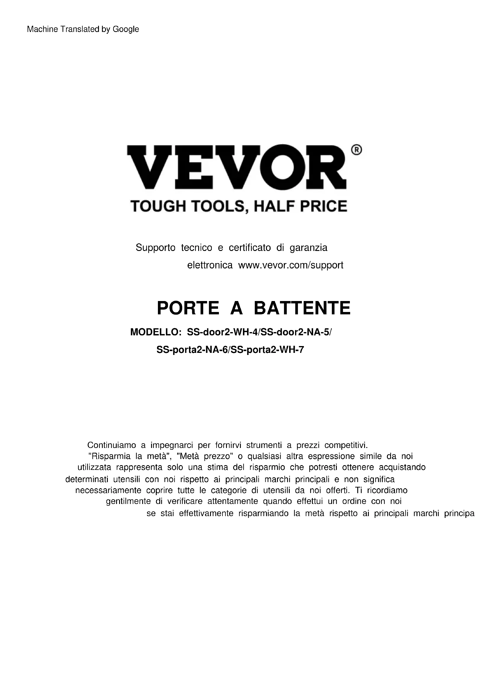 Machine Translated by GoogleTechnischer Support und E-Garantie-Zertifikat www.vevor.com/support Machine Translated by GoogleMODELLO: SS-door2-WH-4/SS-door2-NA-5/ SS-porta2-NA-6/SS-porta2-WH-7 "Risparmia la metà", "Metà prezzo" o qualsiasi altra espressione simile da noi utilizzata rappresenta solo una stima del risparmio che potresti ottenere acquistando determinati utensili con noi rispetto ai principali marchi principali e non significa necessariamente coprire tutte le categorie di utensili da noi offerti. Ti ricordiamo gentilmente di verificare attentamente quando effettui un ordine con noi se stai effettivamente risparmiando la metà rispetto ai principali marchi principali. Continuiamo a impegnarci per fornirvi strumenti a prezzi competitivi.