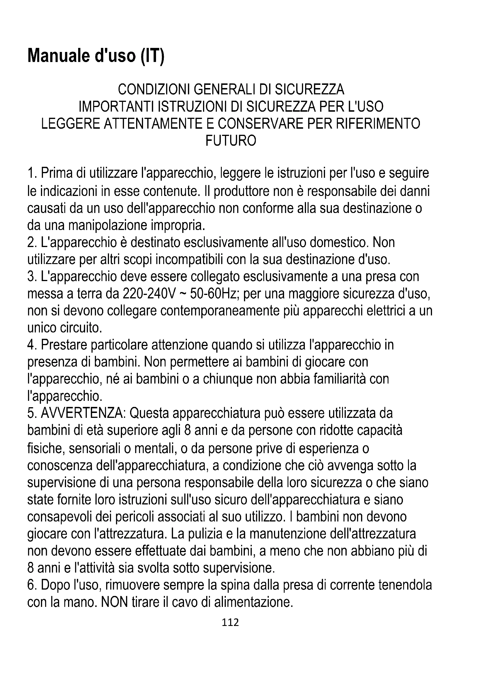 messa a terra da 220-240V ~ 50-60Hz; per una maggiore sicurezza d'uso, non si devono collegare contemporaneamente più apparecchi elettrici a un unico circuito.
