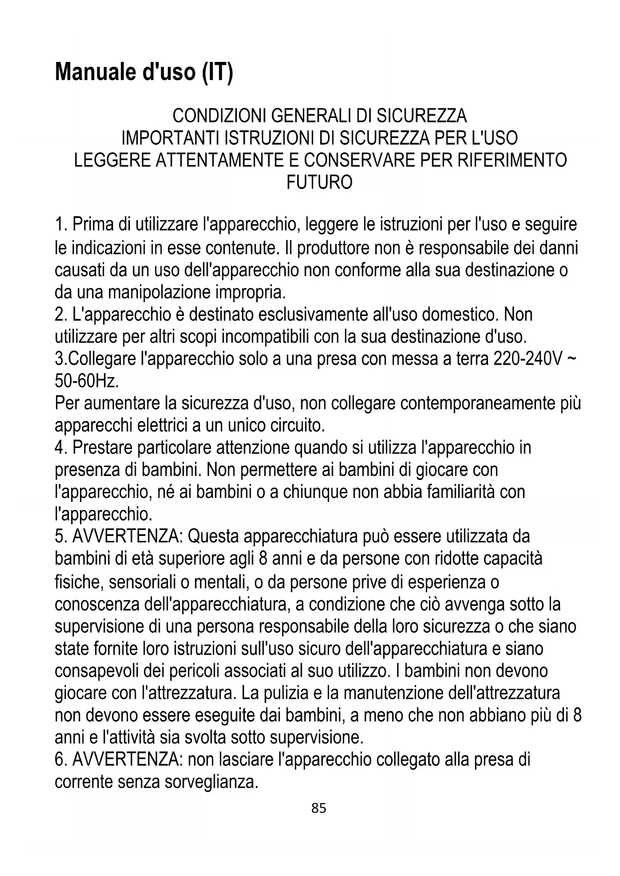 utilizzare per altri scopi incompatibili con la sua destinazione d'uso. 3.Collegare l'apparecchio solo a una presa con messa a terra 220-240V ~ 50-60Hz. Per aumentare la sicurezza d'uso, non collegare contemporaneamente più apparecchi elettrici a un unico circuito.