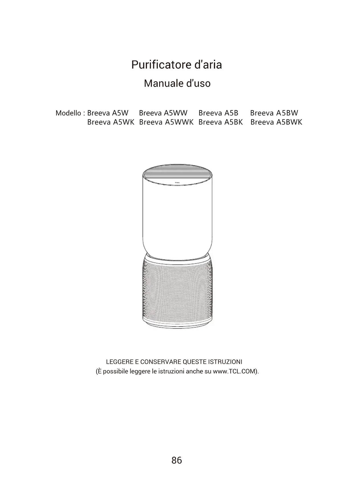 (È possibile leggere le istruzioni anche su www.TCL.COM). Modello : Breeva A5W Breeva A5WW Breeva A5B Breeva A5BW Breeva A5WK Breeva A5WWK Breeva A5BK Breeva A5BWK87 Descrizione del prodotto Lista d'imballaggio Nome di ciascuna parte Precauzioni di sicurezza Per iniziare Pannello di controllo7 Istruzioni Istruzioni per la connessione dell'APP Manutenzione Risoluzione dei problemi Specifiche tecniche Assistenza clienti
