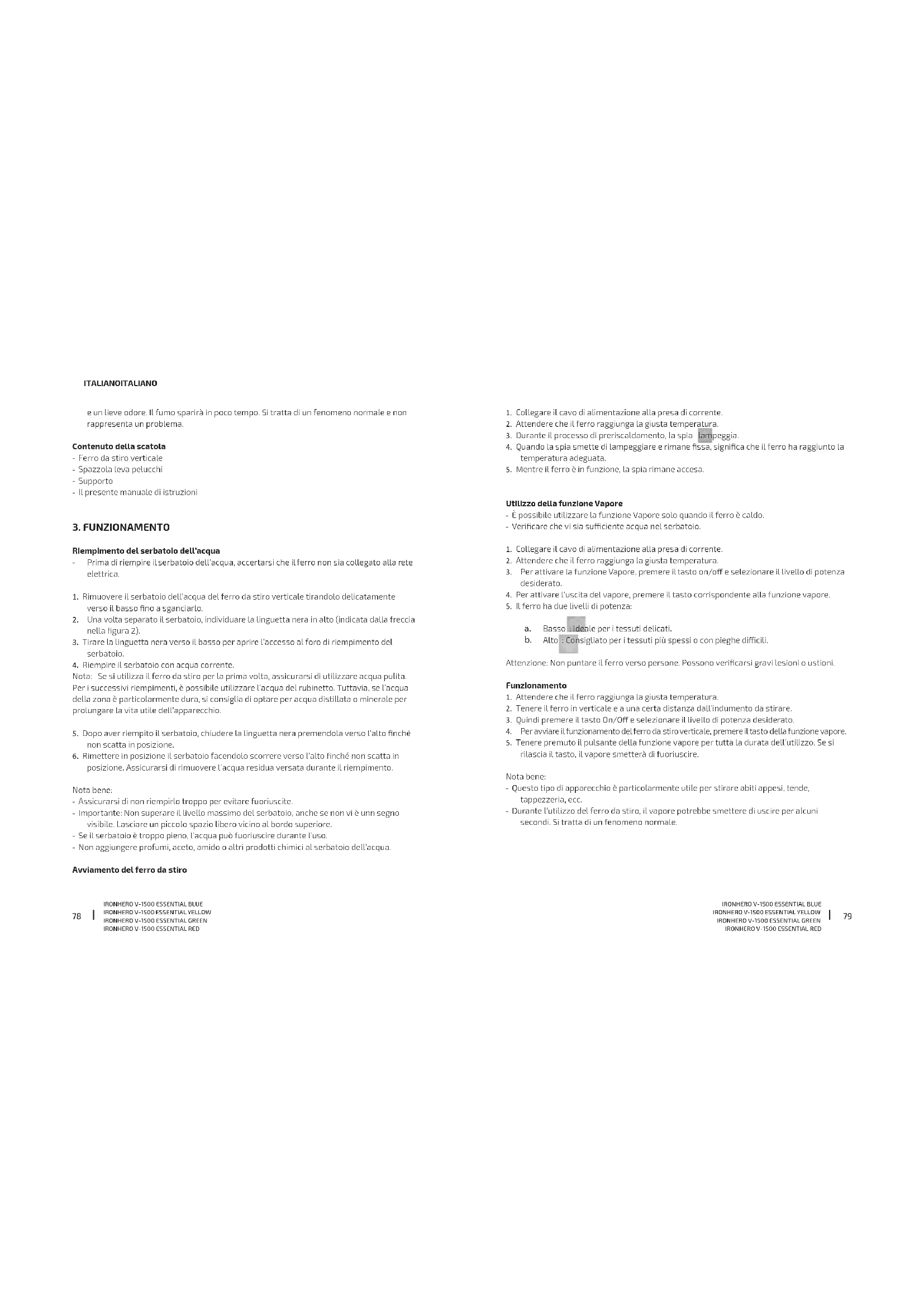 - Avvertenza: se l’apparecchio dovesse cadere accidentalmente in acqua, scollegarlo immediatamente.IRONHERO V-1500 ESSENTIAL BLUE