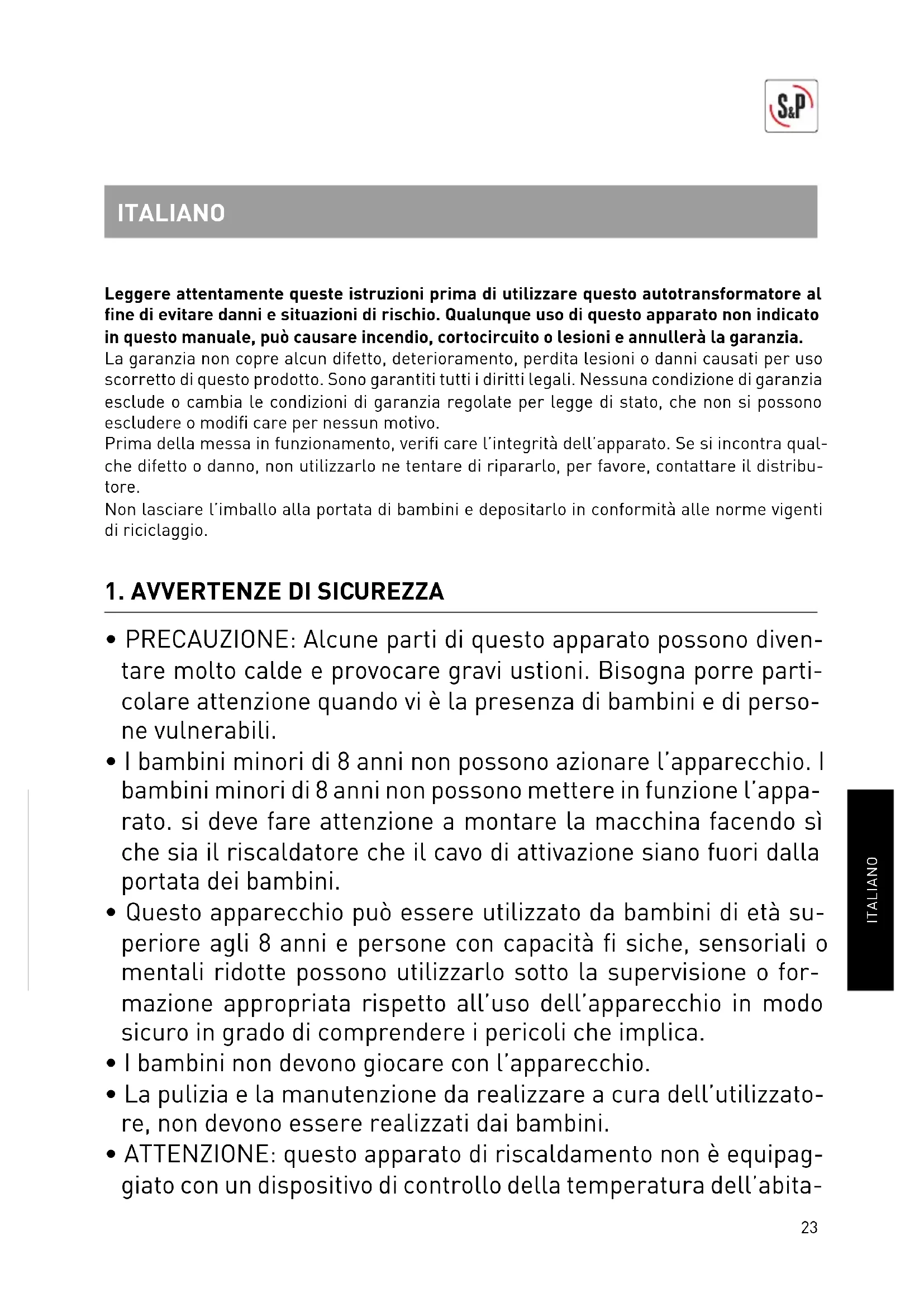 S&P’s large Technical Service network will guarantee adequate technical assistance. If a fault is observed in the unit, please contact any of the mentioned technical service offi ces and they will attend to your problem. Any manipulation of the appliance by personnel not belonging to the Offi cial S&P Services will result in your guarantee being void. For any queries regarding S&P products please contact any branch of our After Sales Service network if you are in Spain, or your regular dealer in the rest of the world. To fi nd your nearest dealer, visit our website at www.solerpalau.com23 ITALIANO ITALIANO Leggere attentamente queste istruzioni prima di utilizzare questo autotransformatore al fi ne di evitare danni e situazioni di rischio. Qualunque uso di questo apparato non indicato in questo manuale, può causare incendio, cortocircuito o lesioni e annullerà la garanzia. La garanzia non copre alcun difetto, deterioramento, perdita lesioni o danni causati per uso scorretto di questo prodotto. Sono garantiti tutti i diritti legali. Nessuna condizione di garanzia esclude o cambia le condizioni di garanzia regolate per legge di stato, che non si possono escludere o modifi care per nessun motivo. Prima della messa in funzionamento, verifi care l’integrità dell’apparato. Se si incontra qual- che difetto o danno, non utilizzarlo ne tentare di ripararlo, per favore, contattare il distribu- tore. Non lasciare l’imballo alla portata di bambini e depositarlo in conformità alle norme vigenti di riciclaggio.