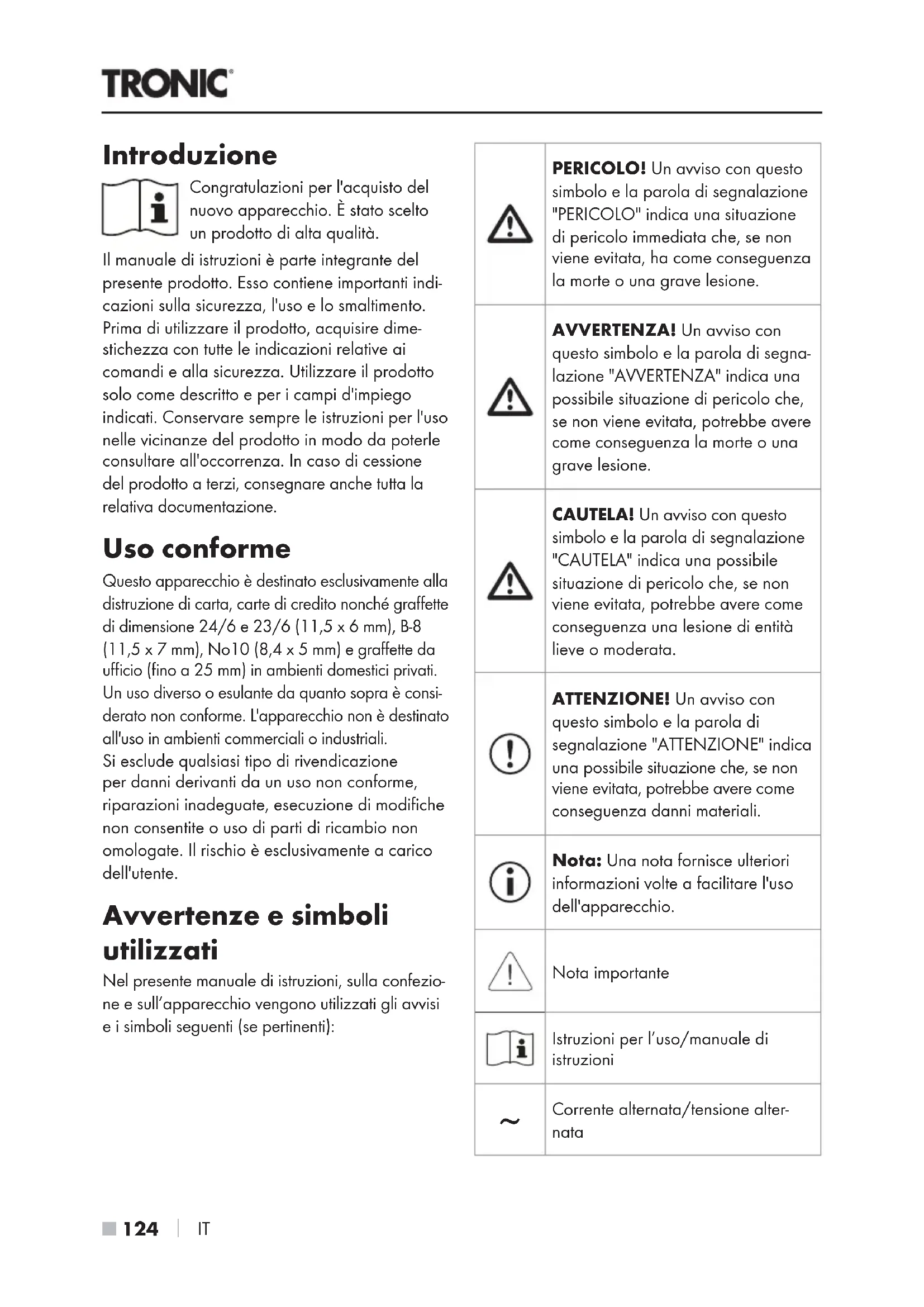 IT Introduzione Congratulazioni per l'acquisto del nuovo apparecchio. È stato scelto un prodotto di alta qualità. Il manuale di istruzioni è parte integrante del presente prodotto. Esso contiene importanti indi- cazioni sulla sicurezza, l'uso e lo smaltimento. Prima di utilizzare il prodotto, acquisire dime- stichezza con tutte le indicazioni relative ai comandi e alla sicurezza. Utilizzare il prodotto solo come descritto e per i campi d'impiego indicati. Conservare sempre le istruzioni per l'uso nelle vicinanze del prodotto in modo da poterle consultare all'occorrenza. In caso di cessione del prodotto a terzi, consegnare anche tutta la relativa documentazione. Uso conforme Questo apparecchio è destinato esclusivamente alla distruzione di carta, carte di credito nonché graffette di dimensione 24/6 e 23/6 (11,5 x 6 mm), B-8 (11,5 x 7 mm), No10 (8,4 x 5 mm) e graffette da ufficio (fino a 25 mm) in ambienti domestici privati. Un uso diverso o esulante da quanto sopra è consi- derato non conforme. L'apparecchio non è destinato all'uso in ambienti commerciali o industriali. Si esclude qualsiasi tipo di rivendicazione per danni derivanti da un uso non conforme, riparazioni inadeguate, esecuzione di modifiche non consentite o uso di parti di ricambio non omologate. Il rischio è esclusivamente a carico dell'utente. Avvertenze e simboli utilizzati Nel presente manuale di istruzioni, sulla confezio- ne e sull’apparecchio vengono utilizzati gli avvisi e i simboli seguenti (se pertinenti): PERICOLO! Un avviso con questo simbolo e la parola di segnalazione "PERICOLO" indica una situazione di pericolo immediata che, se non viene evitata, ha come conseguenza la morte o una grave lesione. AVVERTENZA! Un avviso con questo simbolo e la parola di segna- lazione "AVVERTENZA" indica una possibile situazione di pericolo che, se non viene evitata, potrebbe avere come conseguenza la morte o una grave lesione. CAUTELA! Un avviso con questo simbolo e la parola di segnalazione "CAUTELA" indica una possibile situazione di pericolo che, se non viene evitata, potrebbe avere come conseguenza una lesione di entità lieve o moderata. ATTENZIONE! Un avviso con questo simbolo e la parola di segnalazione "ATTENZIONE" indica una possibile situazione che, se non viene evitata, potrebbe avere come conseguenza danni materiali. Nota: Una nota fornisce ulteriori informazioni volte a facilitare l'uso dell'apparecchio. Nota importante Istruzioni per l’uso/manuale di istruzioni