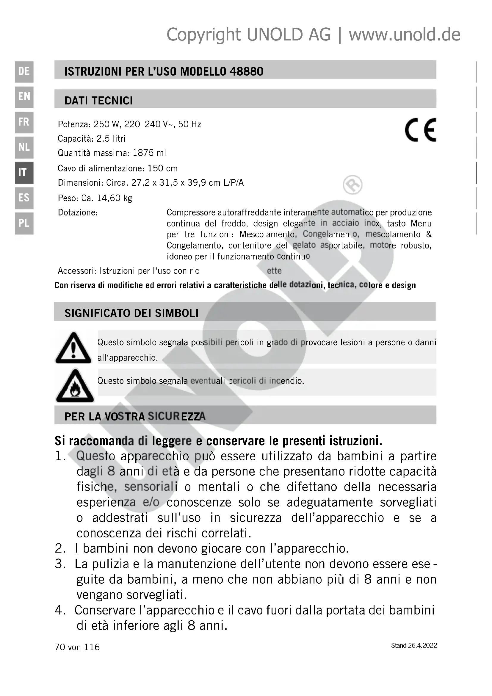 Conservare l’apparecchio e il cavo fuori dalla portata dei bambini di età inferiore agli 8 anni. Copyright UNOLD AG | www.unold.deStand 26.4.2022 71 von 116