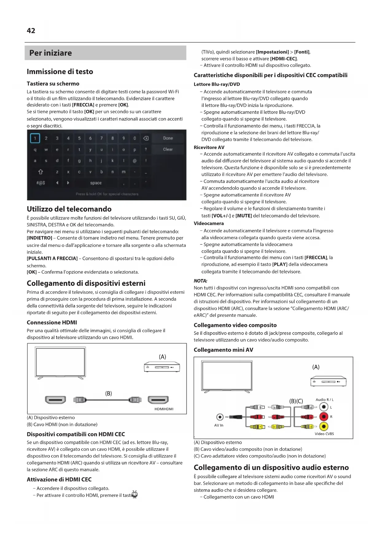 (A) Dispositivo esterno (B) Cavo HDMI (non in dotazione) Dispositivi compatibili con HDMI CEC Se un dispositivo compatibile con HDMI CEC (ad es. lettore Blu-ray, ricevitore AV) è collegato con un cavo HDMI, è possibile utilizzare il dispositivo con il telecomando del televisore. Si consiglia di utilizzare il collegamento HDMI (ARC) quando si utilizza un ricevitore AV – consultare la sezione ARC di questo manuale. Attivazione di HDMI CEC ū Accendere il dispositivo collegato. ū Per attivare il controllo HDMI, premere il tasto (TiVo), quindi selezionare [Impostazioni] > [Fonti], scorrere verso il basso e attivare [HDMI-CEC]. ū Attivare il controllo HDMI sul dispositivo collegato. Caratteristiche disponibili per i dispositivi CEC compatibili Lettore Blu-ray/DVD ū Accende automaticamente il televisore e commuta l’ingresso al lettore Blu-ray/DVD collegato quando il lettore Blu-ray/DVD inizia la riproduzione. ū Spegne automaticamente il lettore Blu-ray/DVD collegato quando si spegne il televisore. ū Controlla il funzionamento dei menu, i tasti FRECCIA, la riproduzione e la selezione dei brani del lettore Blu-ray/ DVD collegato tramite il telecomando del televisore. Ricevitore AV ū Accende automaticamente il ricevitore AV collegato e commuta l’uscita audio dal diusore del televisore al sistema audio quando si accende il televisore. Questa funzione è disponibile solo se si è precedentemente utilizzato il ricevitore AV per emettere l’audio del televisore. ū Commuta automaticamente l’uscita audio al ricevitore AV accendendolo quando si accende il televisore. ū Spegne automaticamente il ricevitore AV collegato quando si spegne il televisore. ū Regolare il volume e le funzioni di silenziamento tramite i tasti [VOL+/-] e [MUTE] del telecomando del televisore. Videocamera ū Accende automaticamente il televisore e commuta l’ingresso alla videocamera collegata quando questa viene accesa. ū Spegne automaticamente la videocamera collegata quando si spegne il televisore. ū Controlla il funzionamento dei menu con i tasti [FRECCIA], la riproduzione, ad esempio il tasto [PLAY] della videocamera collegata tramite il telecomando del televisore. NOTA: Non tutti i dispositivi con ingresso/uscita HDMI sono compatibili con HDMI CEC. Per informazioni sulla compatibilità CEC, consultare il manuale di istruzioni del dispositivo. Per informazioni sul collegamento di un dispositivo HDMI (ARC), consultare la sezione “Collegamento HDMI (ARC/ eARC)” del presente manuale. Collegamento video composito Se il dispositivo esterno è dotato di jack/prese composite, collegarlo al televisore utilizzando un cavo video/audio composito. Collegamento mini AV