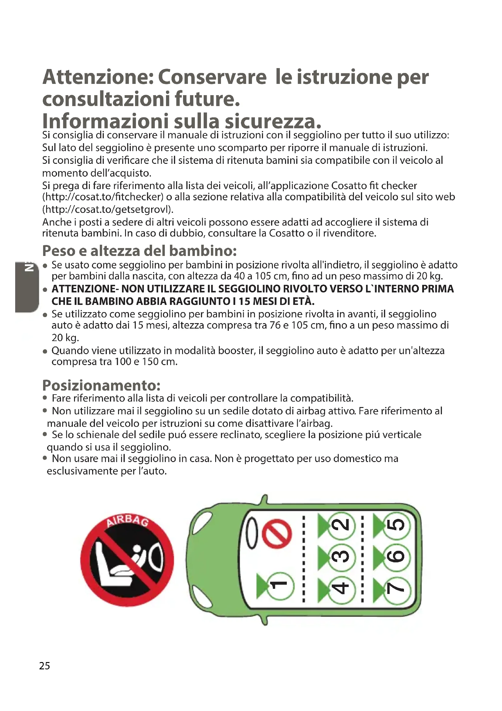 - Non usare mai il seggiolino in casa. Non è progettato per uso domestico ma esclusivamente per l’auto. Attenzione: Conservare le istruzione per consultazioni future. Informazioni sulla sicurezza.