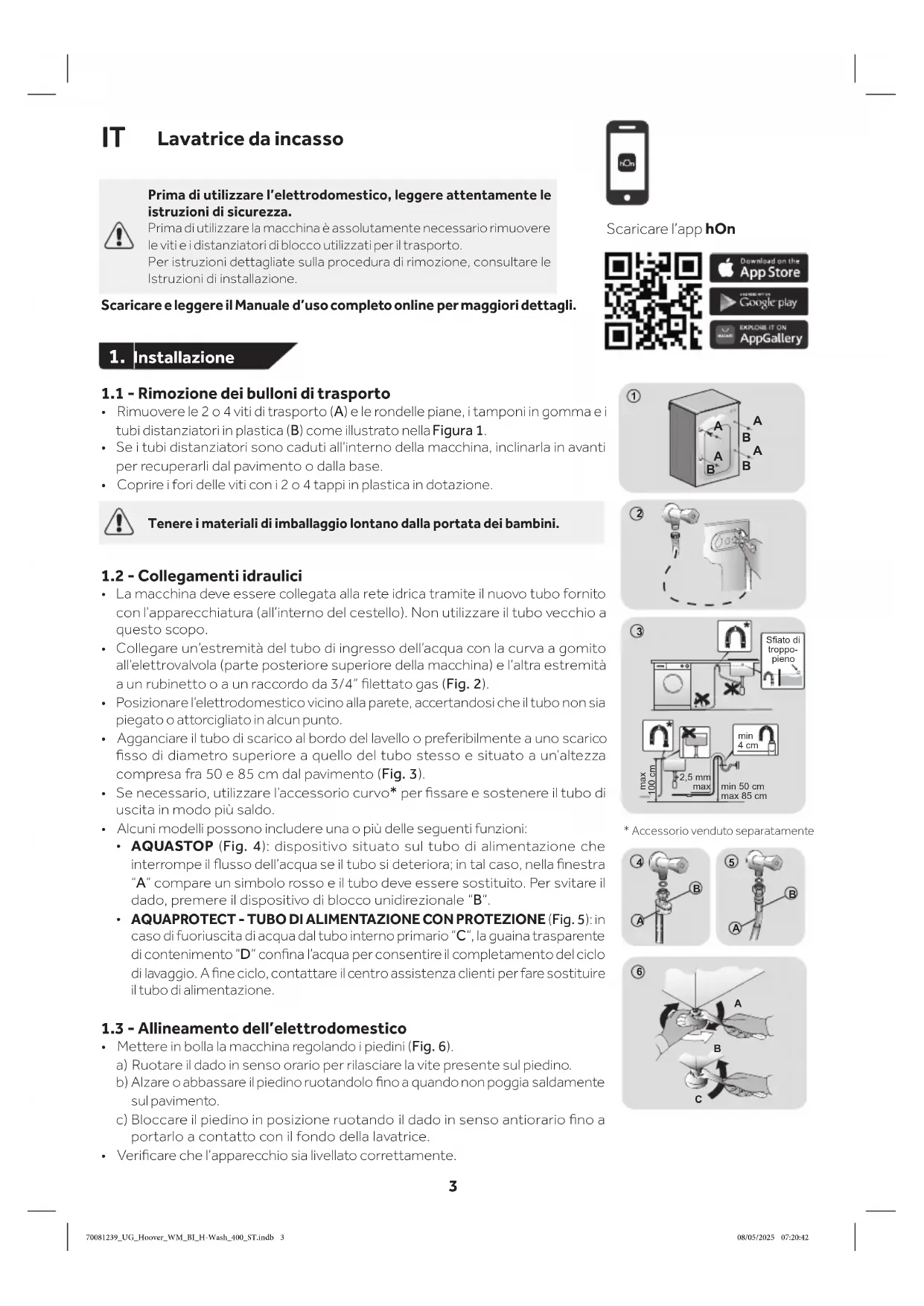 Prima di utilizzare l’elettrodomestico, leggere attentamente le istruzioni di sicurezza. Prima di utilizzare la macchina è assolutamente necessario rimuovere le viti e i distanziatori di blocco utilizzati per il trasporto. Per istruzioni dettagliate sulla procedura di rimozione, consultare le Istruzioni di installazione. Scaricare e leggere il Manuale d’uso completo online per maggiori dettagli. Scaricare l’app hOn