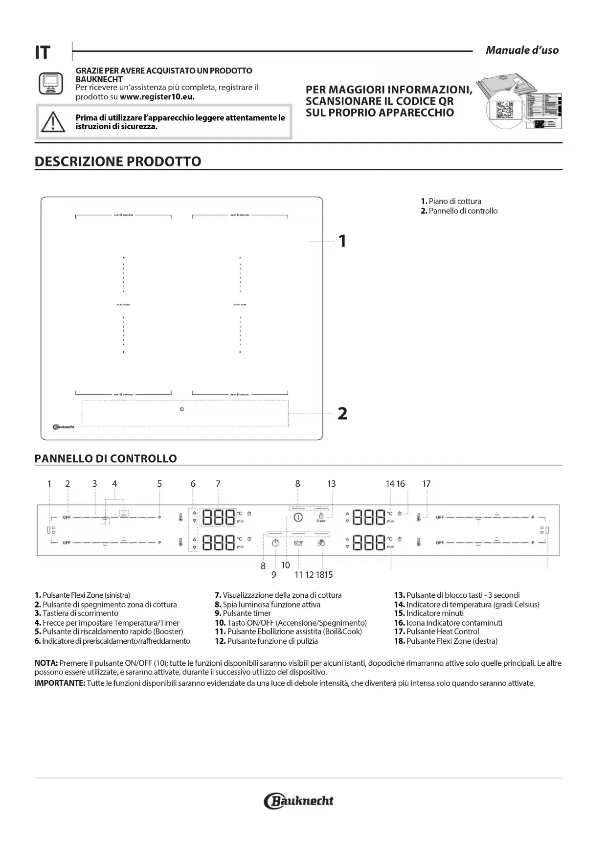 1. Pulsante Flexi Zone (sinistra) 2. Pulsante di spegnimento zona di cottura3. Tastiera di scorrimento4. Frecce per impostare Temperatura/Timer5. Pulsante di riscaldamento rapido (Booster)6. Indicatore di preriscaldamento/raffreddamento7. Visualizzazione della zona di cottura8. Spia luminosa funzione attiva9. Pulsante timer10. Tasto ON/OFF (Accensione/Spegnimento)11. Pulsante Ebollizione assistita (Boil&Cook)12. Pulsante funzione di pulizia13. Pulsante di blocco tasti - 3 secondi14. Indicatore di temperatura (gradi Celsius)15. Indicatore minuti 16. Icona indicatore contaminuti17. Pulsante Heat Control18. Pulsante Flexi Zone (destra)GRAZIE PER AVERE ACQUISTATO UN PRODOTTO BAUKNECHTPer ricevere un’assistenza più completa, registrare il prodotto su www.register10.eu. PER MAGGIORI INFORMAZIONI,