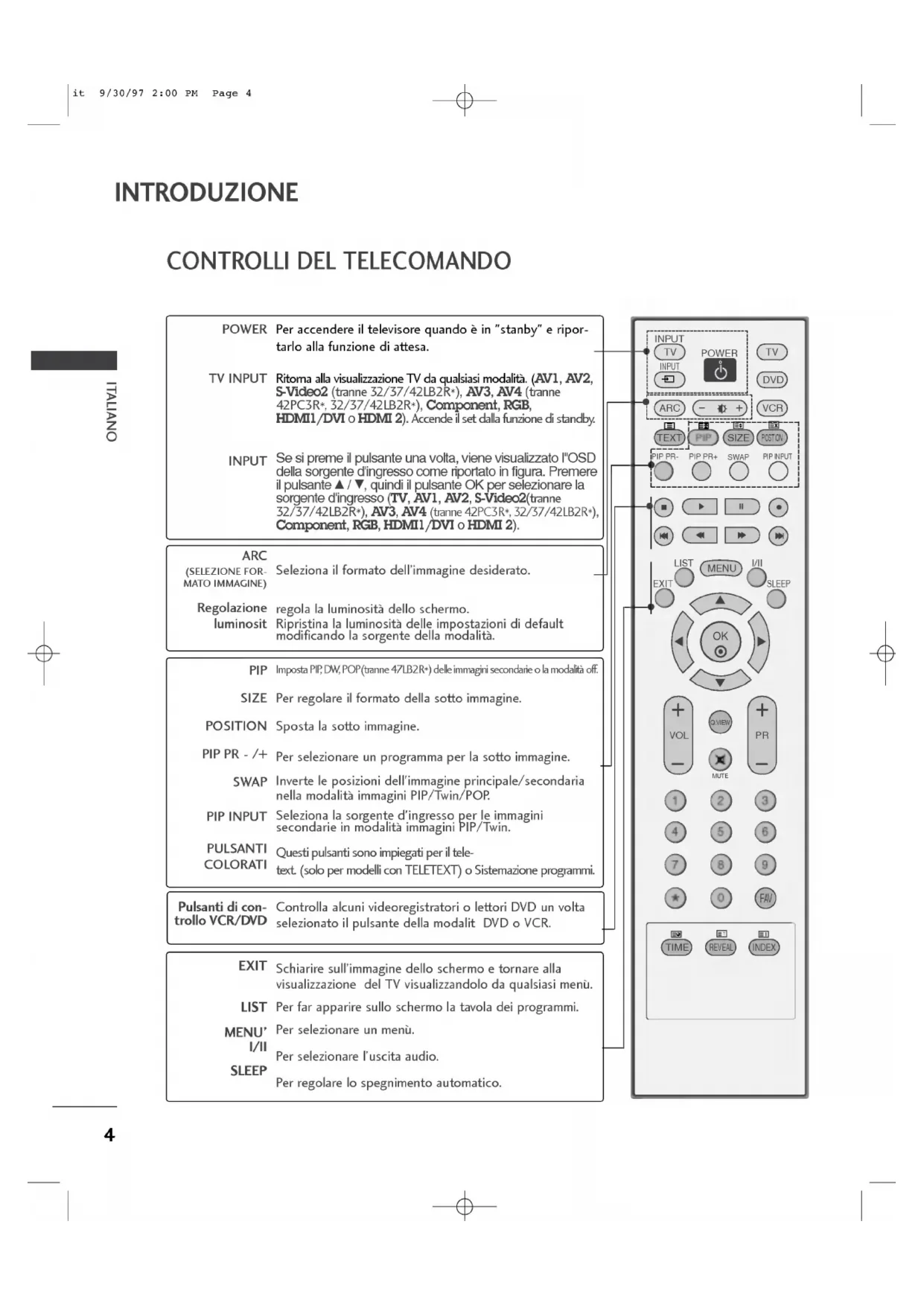 ITALIANO INTRODUZIONE CONTROLLI Sitrattadiuna rappresentazione semplificata del pannello frontale.In questa rappresentazione cipossonoessereeventualidifferenze rispetto allaTVfornita. Controlli del pannello frontale Pulsanti PROGRAMMA Pulsanti VOLUME Pulsanti MENU Pulsanti Pulsanti INPUT Pulsanti POWER Indicatore?E'rosso quando l'apparecchio standby, cioinattesadicomandi.?diventadicolorebianco quando siattiva l'apparecchio. Pulsanti PROGRAMMA Pulsanti VOLUME Pulsanti Pulsanti MENU Pulsanti INPUT Pulsanti POWER Pulsanti PROGRAMMA Pulsanti VOLUME Pulsanti Pulsanti MENU Pulsanti INPUT Pulsanti POWER INPUTMENUOKVOLPRPulsanti INPUT Pulsanti VOLUME Pulsanti PROGRAMMA Pulsanti MENU Pulsanti Pulsanti POWER 9/30/97 2:00PM Page 2ITALIANO OPZIONI
