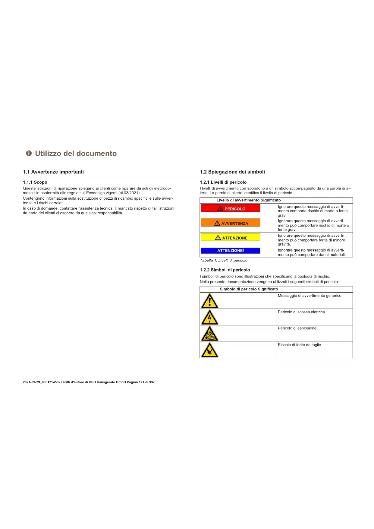 I simboli di pericolo sono illustrazioni che specificano la tipologia di rischio. Nella presente documentazione vengono utilizzati i seguenti simboli di pericolo: Simbolo di pericolo Significato Messaggio di avvertimento generico Pericolo di scossa elettrica Pericolo di esplosione Rischio di ferite da taglio Utilizzo del documento 2021-09-29_8001214502 Diritti d'autore di BSH Hausgeräte GmbH Pagina171di337Simbolo di pericolo Significato Pericolo di schiacciamento Pericolo derivante da superfici calde Pericolo derivante da forti campi magneti-
