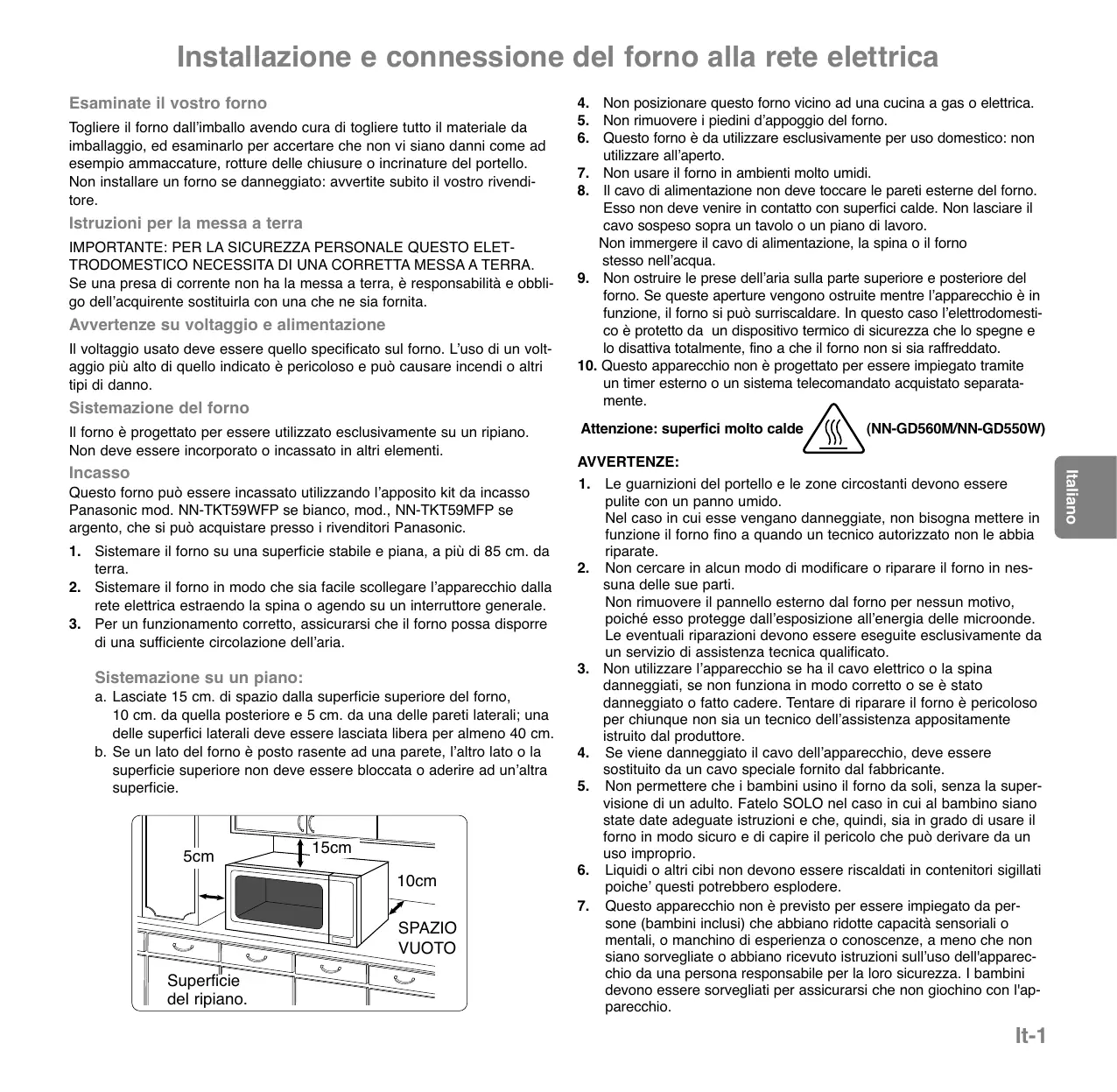 di una sufficiente circolazione dellʼaria. Sistemazione su un piano: a. Lasciate 15 cm. di spazio dalla superficie superiore del forno, 10 cm. da quella posteriore e 5 cm. da una delle pareti laterali; una delle superfici laterali deve essere lasciata libera per almeno 40 cm. b. Se un lato del forno è posto rasente ad una parete, lʼaltro lato o la superficie superiore non deve essere bloccata o aderire ad unʼaltra superficie. 5cm 15cm 10cm SPAZIO VUOTO Superficie del ripiano. Attenzione: superfici molto calde (NN-GD560M/NN-GD550W) AVVERTENZE: