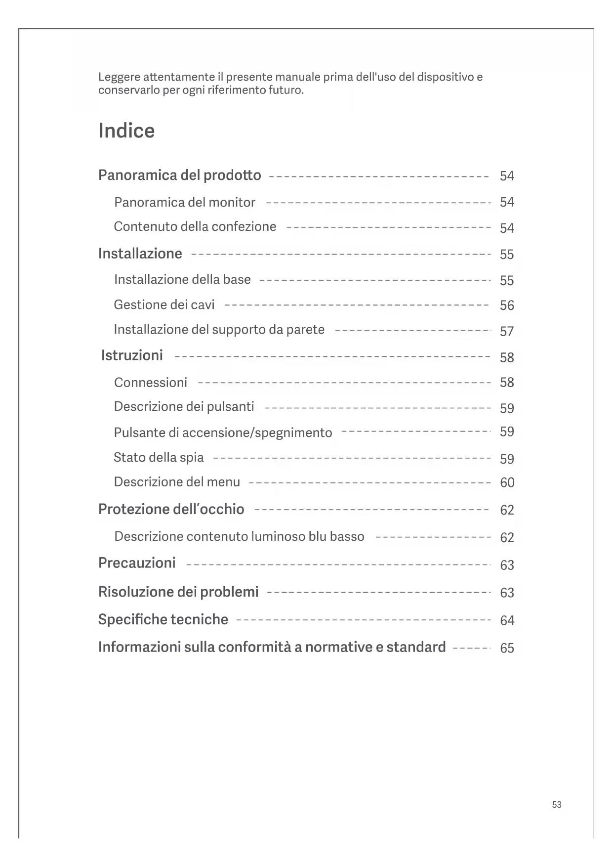 Panoramica del prodoo Panoramica del monitor Contenuto della confezione Installazione Installazione della base Gestione dei cavi Installazione del supporto da parete Istruzioni Connessioni Descrizione dei pulsanti Pulsante di accensione/spegnimento Stato della spia Descrizione del menu Precauzioni Risoluzione dei problemi