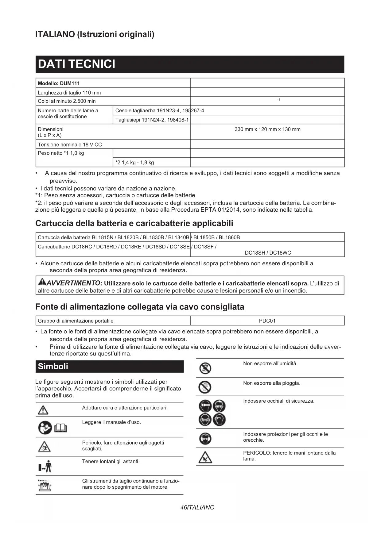 - I dati tecnici possono variare da nazione a nazione. *1: Peso senza accessori, cartuccia o cartucce delle batterie *2: il peso può variare a seconda dell’accessorio o degli accessori, inclusa la cartuccia della batteria. La combina- zione più leggera e quella più pesante, in base alla Procedura EPTA 01/2014, sono indicate nella tabella. Cartuccia della batteria e caricabatterie applicabili Cartuccia della batteria BL1815N / BL1820B / BL1830B / BL1840B / BL1850B / BL1860B Caricabatterie DC18RC / DC18RD / DC18RE / DC18SD / DC18SE / DC18SF / DC18SH / DC18WC