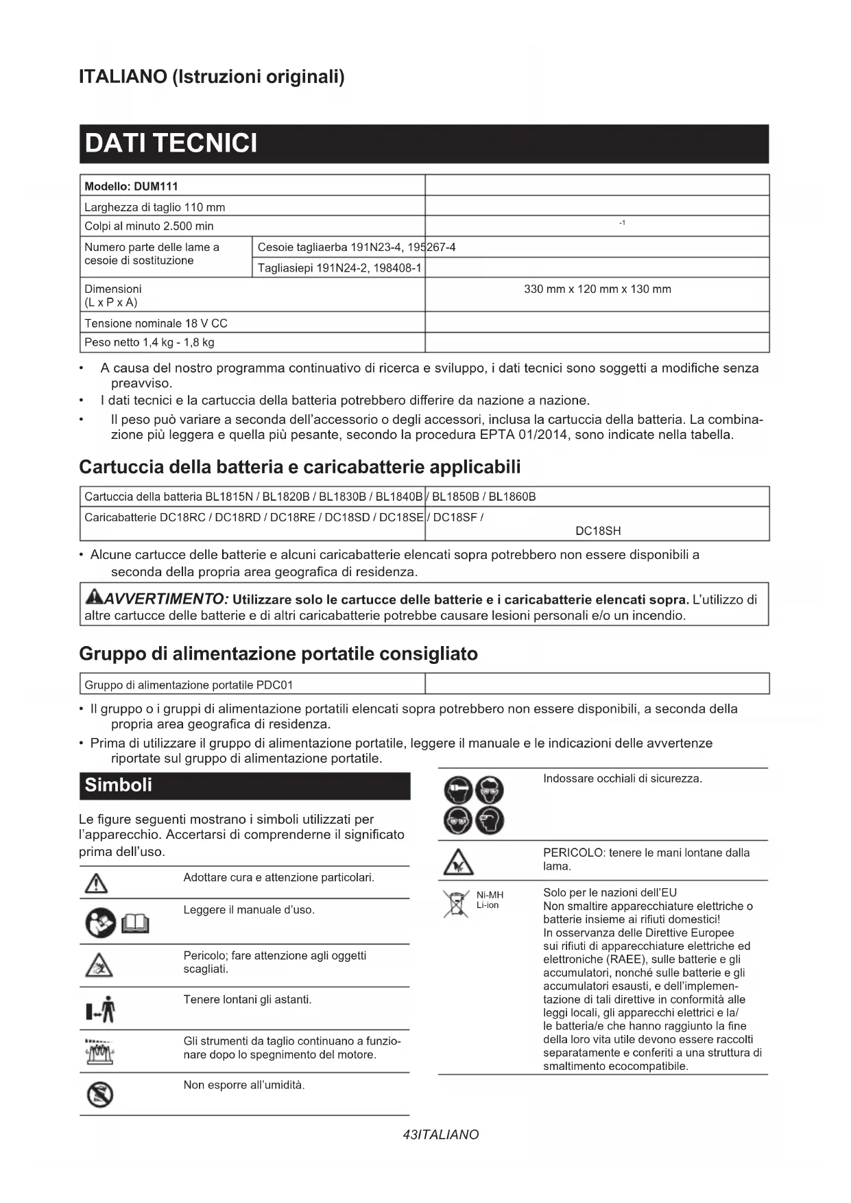 - Prima di utilizzare il gruppo di alimentazione portatile, leggere il manuale e le indicazioni delle avvertenze riportate sul gruppo di alimentazione portatile. Simboli Legureseguentimostranoisimboliutilizzatiper l’apparecchio.Accertarsidicomprenderneilsignicato prima dell’uso. Adottare cura e attenzione particolari. Leggere il manuale d’uso. Pericolo; fare attenzione agli oggetti scagliati. Tenere lontani gli astanti. Gli strumenti da taglio continuano a funzio- nare dopo lo spegnimento del motore. Nonesporreall’umidità. Indossare occhiali di sicurezza. PERICOLO: tenere le mani lontane dalla lama. Ni-MH Li-ion Solo per le nazioni dell’EU Non smaltire apparecchiature elettriche o batterieinsiemeairiutidomestici! In osservanza delle Direttive Europee suiriutidiapparecchiatureelettricheed elettroniche (RAEE), sulle batterie e gli accumulatori, nonché sulle batterie e gli accumulatori esausti, e dell’implemen- tazioneditalidirettiveinconformitàalle leggi locali, gli apparecchi elettrici e la/ lebatteria/echehannoraggiuntolane della loro vita utile devono essere raccolti separatamente e conferiti a una struttura di smaltimento ecocompatibile.44 ITALIANO Utilizzo previsto L’utensileèdestinatoaltagliodibordideipratiodei germogli. Rumore Livello tipico di rumore pesato A determinato in base allo standard EN50636-2-94: DUM111 con lama a cesoie per cesoie tagliaerba installata Livello di pressione sonora (L
