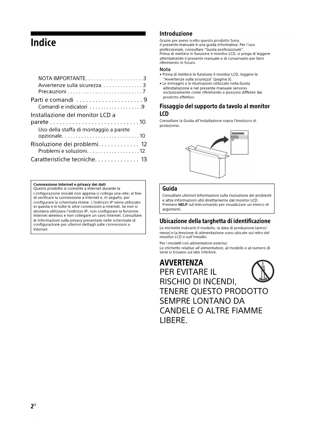 - Educando i bambini sui pericoli implicit i nel salire sui mobili per raggiungere i comandi del monitor LCD. Se il monitor LCD sostituito viene riutilizzato e collocato in un altro post o, adottare gli stessi accorgimenti. Installazione/Impostazione Installare e utilizzare il monitor LCD attenendosi alle istruzioni di seguito al fine di evitare il rischio di incendi, scosse elettriche o danni e/o lesioni. Installazione