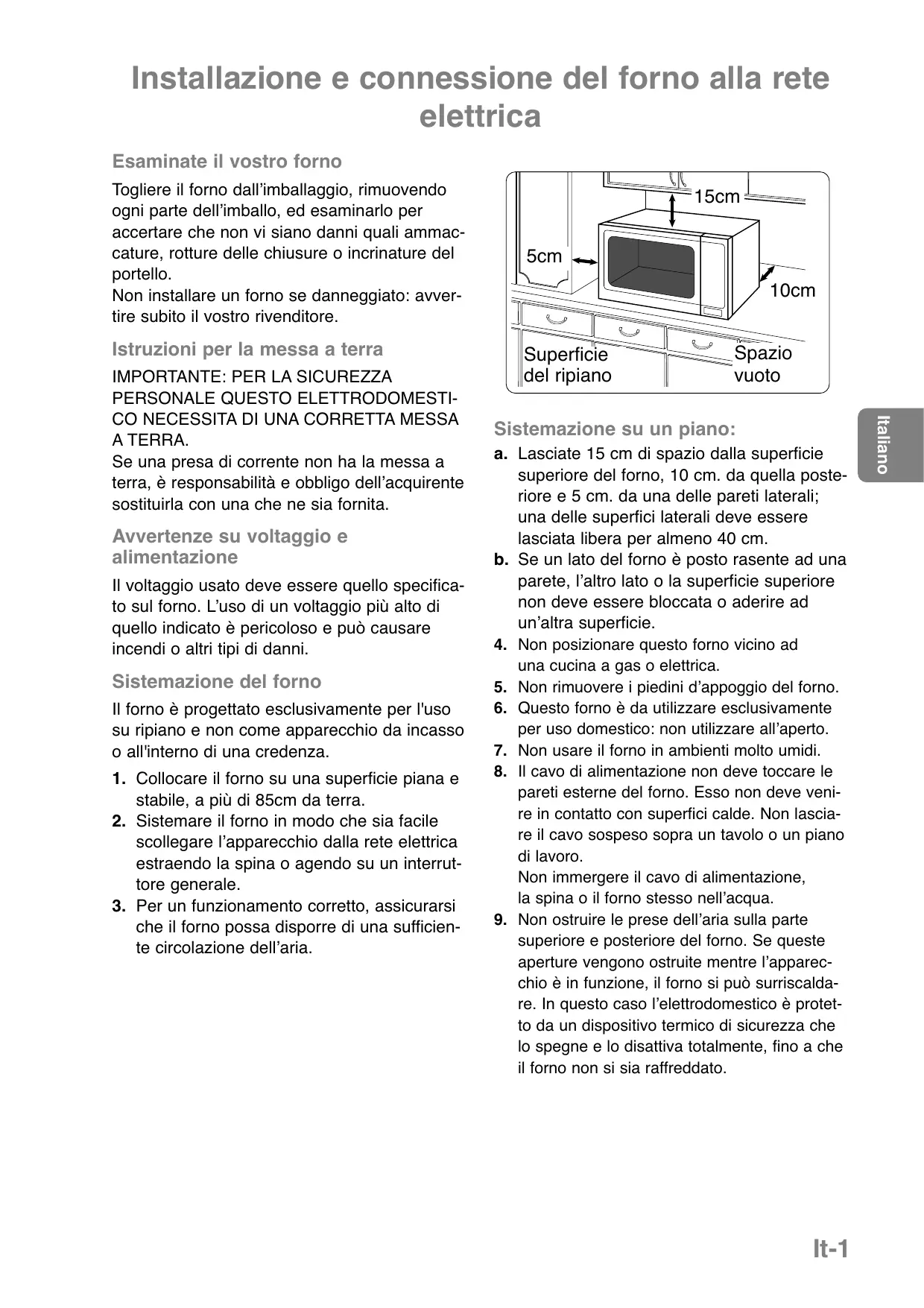 che il forno possa disporre di una sufficiente circolazione dellʼaria. 5cm 10cm Superficie del ripiano Spazio vuoto Sistemazione su un piano: a. Lasciate 15 cm di spazio dalla superficie superiore del forno, 10 cm. da quella posteriore e 5 cm. da una delle pareti laterali; una delle superfici laterali deve essere lasciata libera per almeno 40 cm. b. Se un lato del forno è posto rasente ad una parete, lʼaltro lato o la superficie superiore non deve essere bloccata o aderire ad unʼaltra superficie.