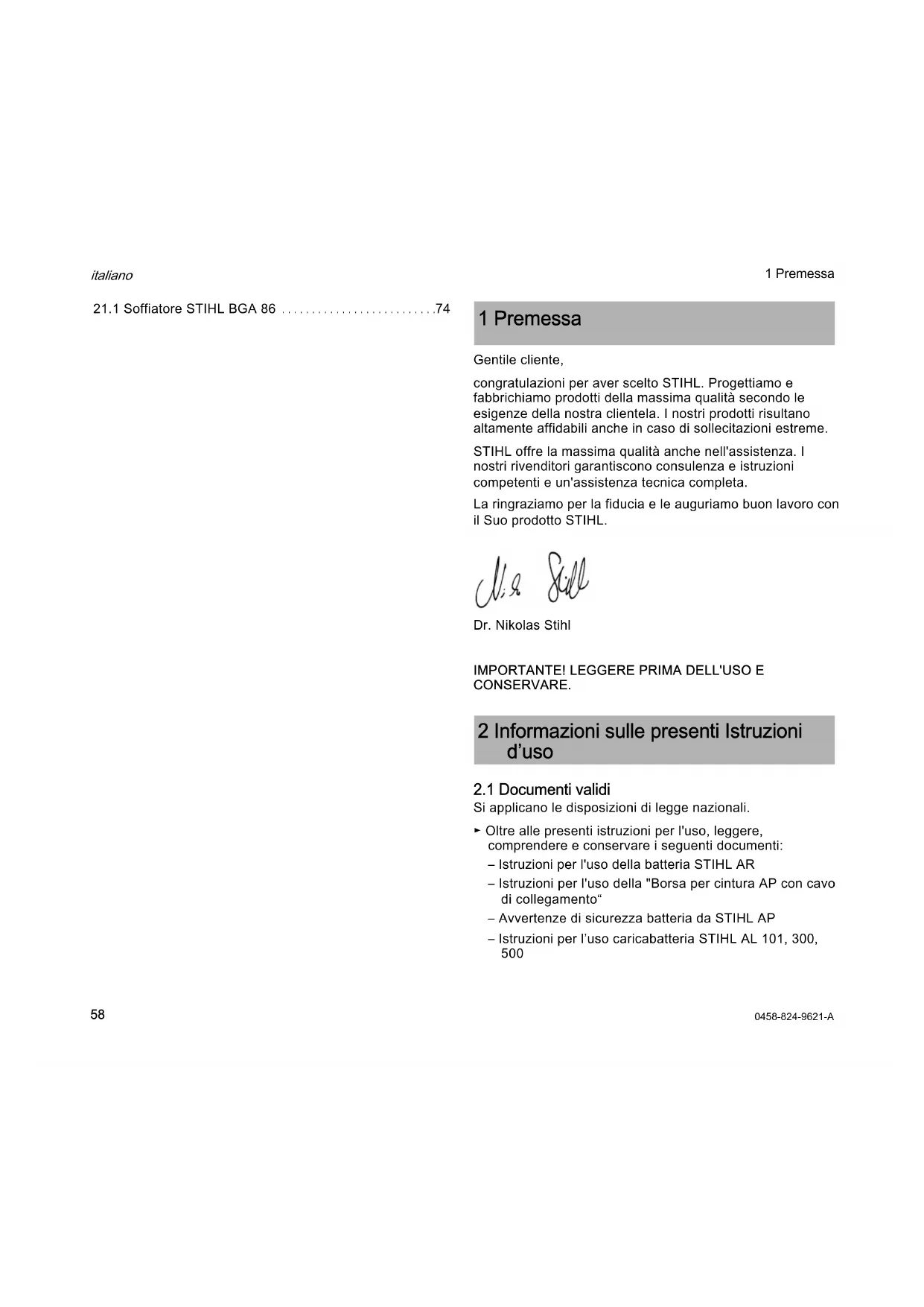 italiano 1 Premessa Gentile cliente, congratulazioni per aver scelto STIHL. Progettiamo e fabbrichiamo prodotti della massima qualità secondo le esigenze della nostra clientela. I nostri prodotti risultano altamente affidabili anche in caso di sollecitazioni estreme. STIHL offre la massima qualità anche nell'assistenza. I nostri rivenditori garantiscono consulenza e istruzioni competenti e un'assistenza tecnica completa. La ringraziamo per la fiducia e le auguriamo buon lavoro con il Suo prodotto STIHL. Dr. Nikolas Stihl