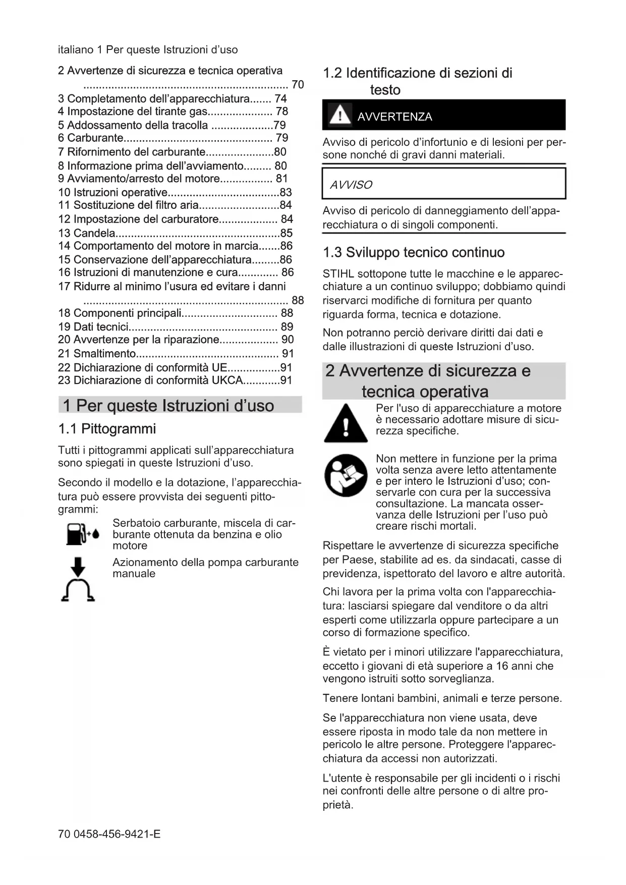 Per queste Istruzioni d’uso........................70 23 UKCA-conformiteitsverklaring italiano 0458-456-9421-E 69 © ANDREAS STIHL AG & Co. KG 2022 0458-456-9421-E. VA0.D22. Stampato su carta candeggiata senza cloro. I colori di stampa contengono oli vegetali; la carta è riciclabile. Originale Istruzioni d'uso 0000004070_023_I2 Avvertenze di sicurezza e tecnica operativa