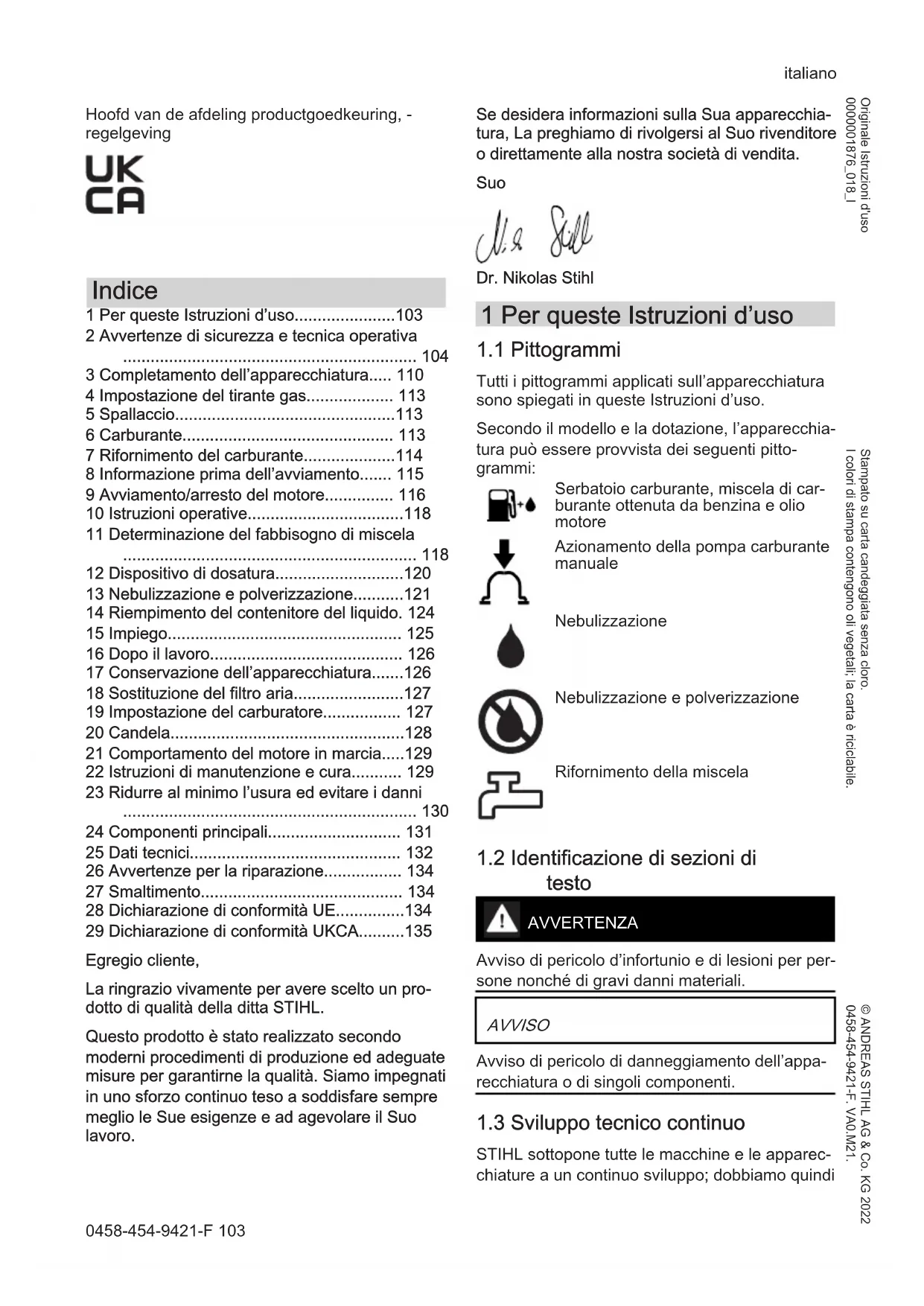 - 29 Dichiarazione di conformità UKCA Egregio cliente, La ringrazio vivamente per avere scelto un pro‐ dotto di qualità della ditta STIHL. Questo prodotto è stato realizzato secondo moderni procedimenti di produzione ed adeguate misure per garantirne la qualità. Siamo impegnati in uno sforzo continuo teso a soddisfare sempre meglio le Sue esigenze e ad agevolare il Suo lavoro. Se desidera informazioni sulla Sua apparecchia‐ tura, La preghiamo di rivolgersi al Suo rivenditore o direttamente alla nostra società di vendita. Suo Dr. Nikolas Stihl 1 Per queste Istruzioni d’uso p. 135
