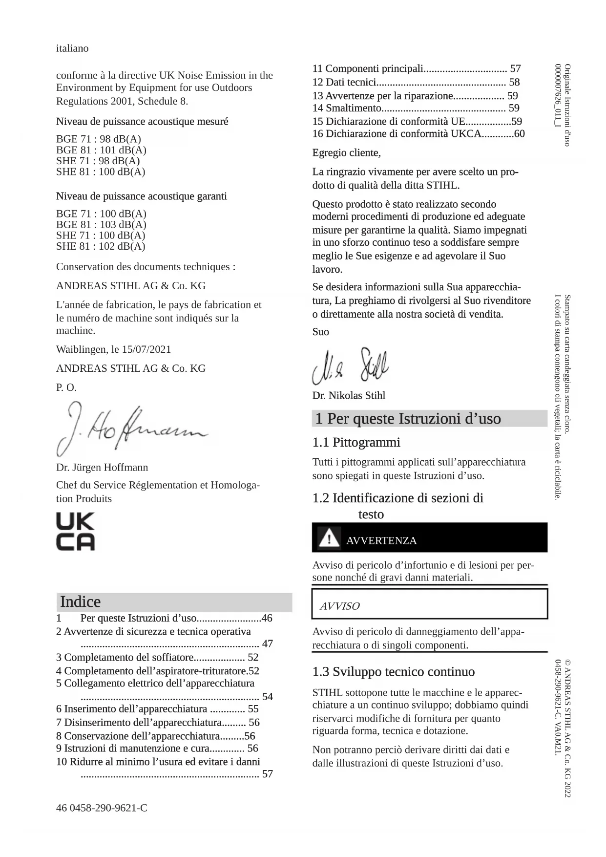 corrisponde alle disposizioni pertinenti di cui alle direttive 2011/65/UE, 2006/42/CE, 2000/14/CE e 2014/30/UE ed è stato sviluppato e fabbricato conformemente alle versioni delle seguenti norme valevoli alla rispettiva data di produzione: EN 50636‑2‑100, EN 55014‑1, EN 55014‑2, EN 60335‑1, EN 61000‑3‑2, EN 61000‑3‑3 La determinazione del livello di potenza acustica misurato e di quello garantito è stata eseguita sulla base della direttiva 2000/14/CE, Allegato V. Livello di potenza acustica misurato BGE 71: 98 dB(A) BGE 81: 101 dB(A) SHE 71: 98 dB(A) SHE 81: 100 dB(A) Livello di potenza acustica garantito BGE 71: 100 dB(A) BGE 81: 103 dB(A) SHE 71: 100 dB(A) SHE 81: 102 dB(A) Documentazione tecnica conservata presso: ANDREAS STIHL AG & Co. KG Produktzulassung L'anno di costruzione, il paese di produzione e il numero di matricola sono indicati sull’apparec‐ chiatura. Waiblingen, 15/07/2021 ANDREAS STIHL AG & Co. KG p.p. 13 Avvertenze per la riparazione italiano 0458-290-9621-C 59Dr. Jürgen Hoffmann Responsabile di reparto omologazione e regola‐ mentazione prodotti 16 Dichiarazione di conformità UKCA ANDREAS STIHL AG & Co. KG Badstr. 115 D-71336 Waiblingen Germania dichiara sotto la propria esclusiva responsabilità che Dispositivo: Soffiatore elettrico Aspira‐ tore-trituratore elettrico Marchio di fabbrica: STIHL Tipo: BGE 61 BGE 71: BGE 81 SHE 71 SHE 81 Identificazione di serie: