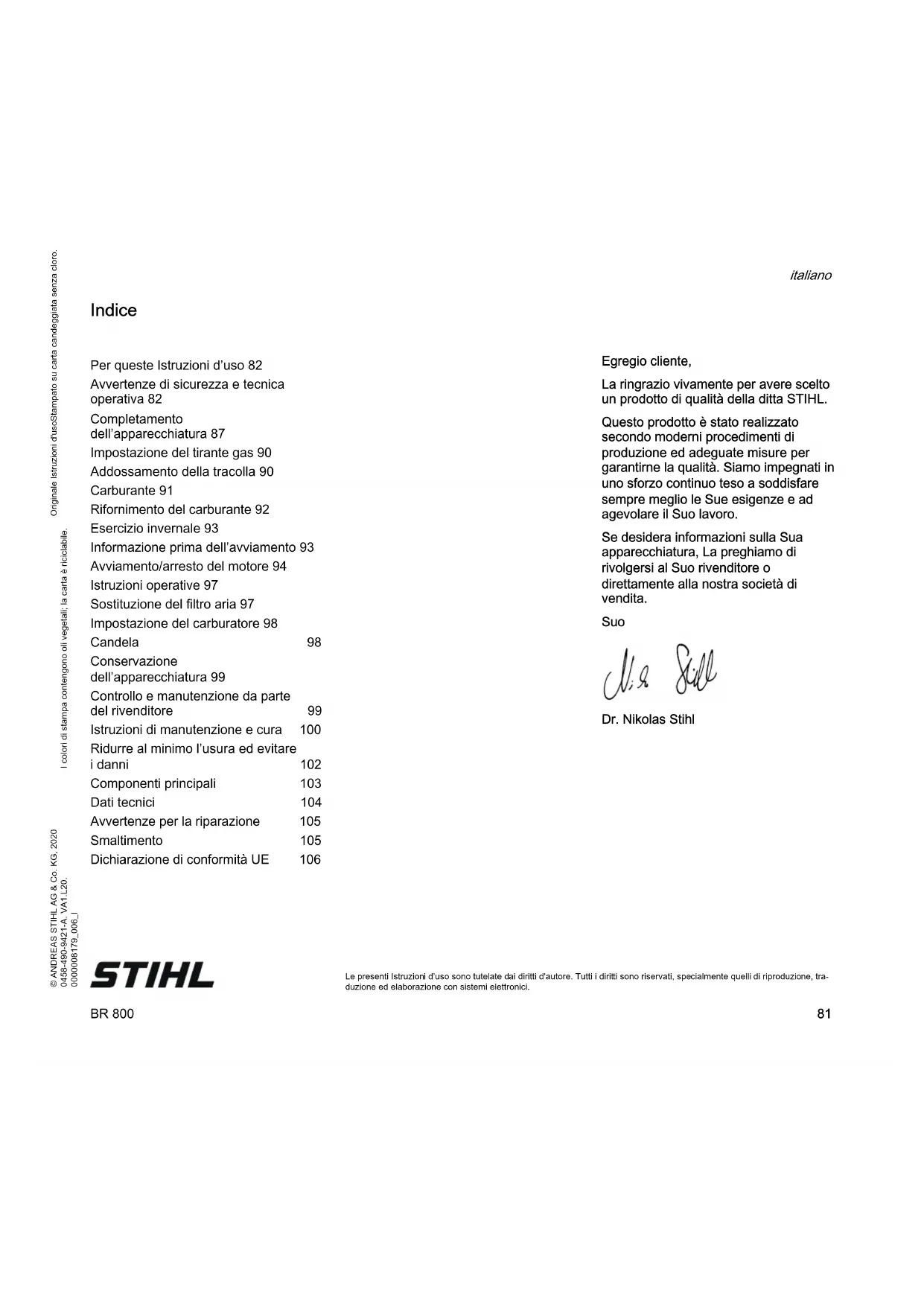 Le presenti Istruzioni d’uso sono tutelate dai diritti d'autore. Tutti i diritti sono riservati, specialmente quelli di riproduzione, tra- duzione ed elaborazione con sistemi elettronici. Indice Egregio cliente, La ringrazio vivamente per avere scelto un prodotto di qualità della ditta STIHL. Questo prodotto è stato realizzato secondo moderni procedimenti di produzione ed adeguate misure per garantirne la qualità. Siamo impegnati in uno sforzo continuo teso a soddisfare sempre meglio le Sue esigenze e ad agevolare il Suo lavoro. Se desidera informazioni sulla Sua apparecchiatura, La preghiamo di rivolgersi al Suo rivenditore o direttamente alla nostra società di vendita. Suo Dr. Nikolas Stihl Per queste Istruzioni d’uso 82 Avvertenze di sicurezza e tecnica operativa 82 Completamento dell’apparecchiatura 87 Impostazione del tirante gas 90 Addossamento della tracolla 90 Carburante 91 Rifornimento del carburante 92 Esercizio invernale 93 Informazione prima dell’avviamento 93 Avviamento/arresto del motore 94 Istruzioni operative 97 Sostituzione del filtro aria 97 Impostazione del carburatore 98 Candela 98 Conservazione dell’apparecchiatura 99 Controllo e manutenzione da parte del rivenditore 99 Istruzioni di manutenzione e cura 100 Ridurre al minimo l’usura ed evitare i danni 102 Componenti principali 103 Dati tecnici 104 Avvertenze per la riparazione 105 Smaltimento 105 Dichiarazione di conformità UE 106BR 800 italiano