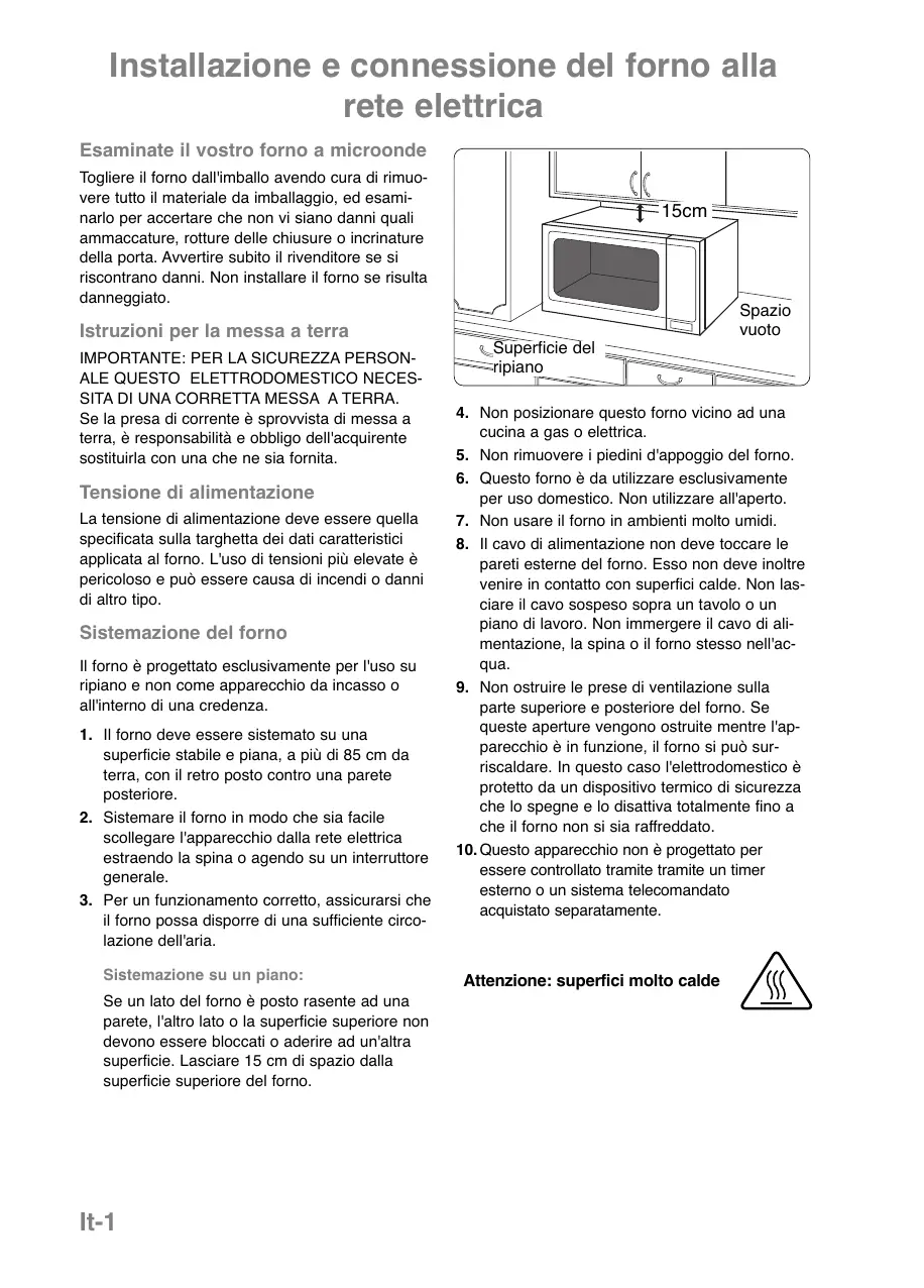 il forno possa disporre di una sufficiente circolazione dell'aria. Sistemazione su un piano: Se un lato del forno è posto rasente ad una parete, l'altro lato o la superficie superiore non devono essere bloccati o aderire ad un'altra superficie. Lasciare 15 cm di spazio dalla superficie superiore del forno. It-1 15cm Spazio vuoto Superficie del ripiano