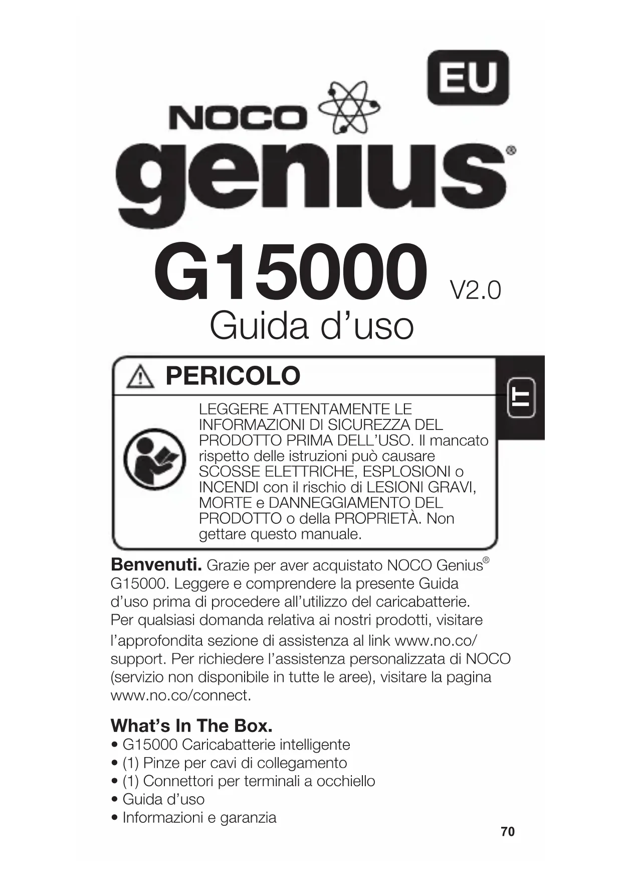 G15000. Leggere e comprendere la presente Guida d’uso prima di procedere all’utilizzo del caricabatterie. Per qualsiasi domanda relativa ai nostri prodotti, visitare l’approfondita sezione di assistenza al link www.no.co/support. Per richiedere l’assistenza personalizzata di NOCO (servizio non disponibile in tutte le aree), visitare la paginawww.no.co/connect. What’s In The Box.