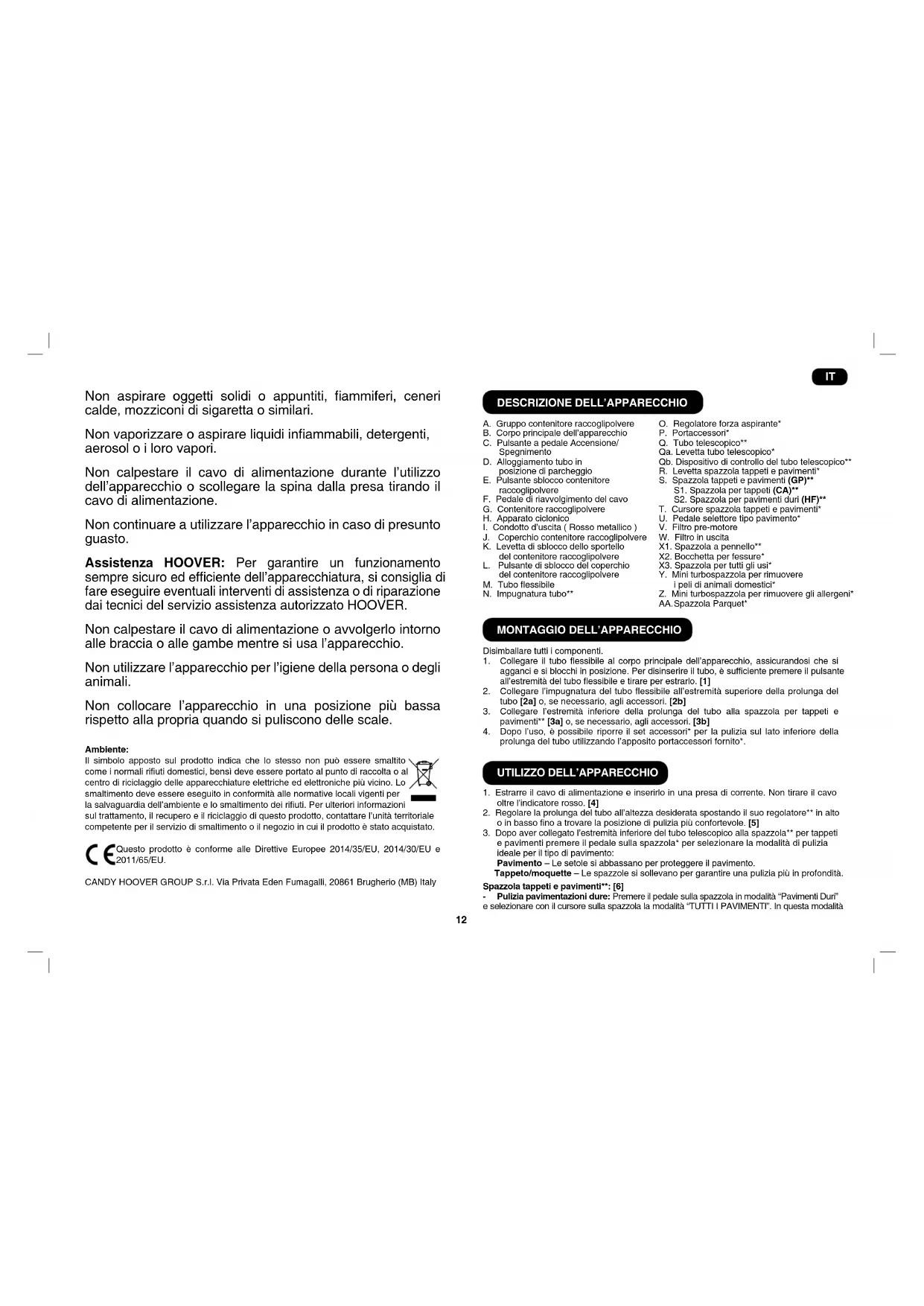 Non aspirare oggetti solidi o appuntiti, ammiferi, ceneri calde, mozziconi di sigaretta o similari. Non vaporizzare o aspirare liquidi inammabili, detergenti, aerosol o i loro vapori. Non calpestare il cavo di alimentazione durante l’utilizzo dell’apparecchio o scollegare la spina dalla presa tirando il cavo di alimentazione. Non continuare a utilizzare l’apparecchio in caso di presunto guasto. Assistenza HOOVER: Per garantire un funzionamento sempre sicuro ed efciente dell’apparecchiatura, si consiglia di fare eseguire eventuali interventi di assistenza o di riparazione dai tecnici del servizio assistenza autorizzato HOOVER. Non calpestare il cavo di alimentazione o avvolgerlo intorno alle braccia o alle gambe mentre si usa l’apparecchio. Non utilizzare l’apparecchio per l’igiene della persona o degli animali. Non collocare l’apparecchio in una posizione più bassa rispetto alla propria quando si puliscono delle scale. Ambiente: Il simbolo apposto sul prodotto indica che lo stesso non può essere smaltito come i normali riuti domestici, bensì deve essere portato al punto di raccolta o al centro di riciclaggio delle apparecchiature elettriche ed elettroniche più vicino. Lo smaltimento deve essere eseguito in conformità alle normative locali vigenti per la salvaguardia dell’ambiente e lo smaltimento dei riuti. Per ulteriori informazioni sul trattamento, il recupero e il riciclaggio di questo prodotto, contattare l’unità territoriale competente per il servizio di smaltimento o il negozio in cui il prodotto è stato acquistato. Questo prodotto è conforme alle Direttive Europee 2014/35/EU, 2014/30/EU e 2011/65/EU. CANDY HOOVER GROUP S.r.l. Via Privata Eden Fumagalli, 20861 Brugherio (MB) Italy