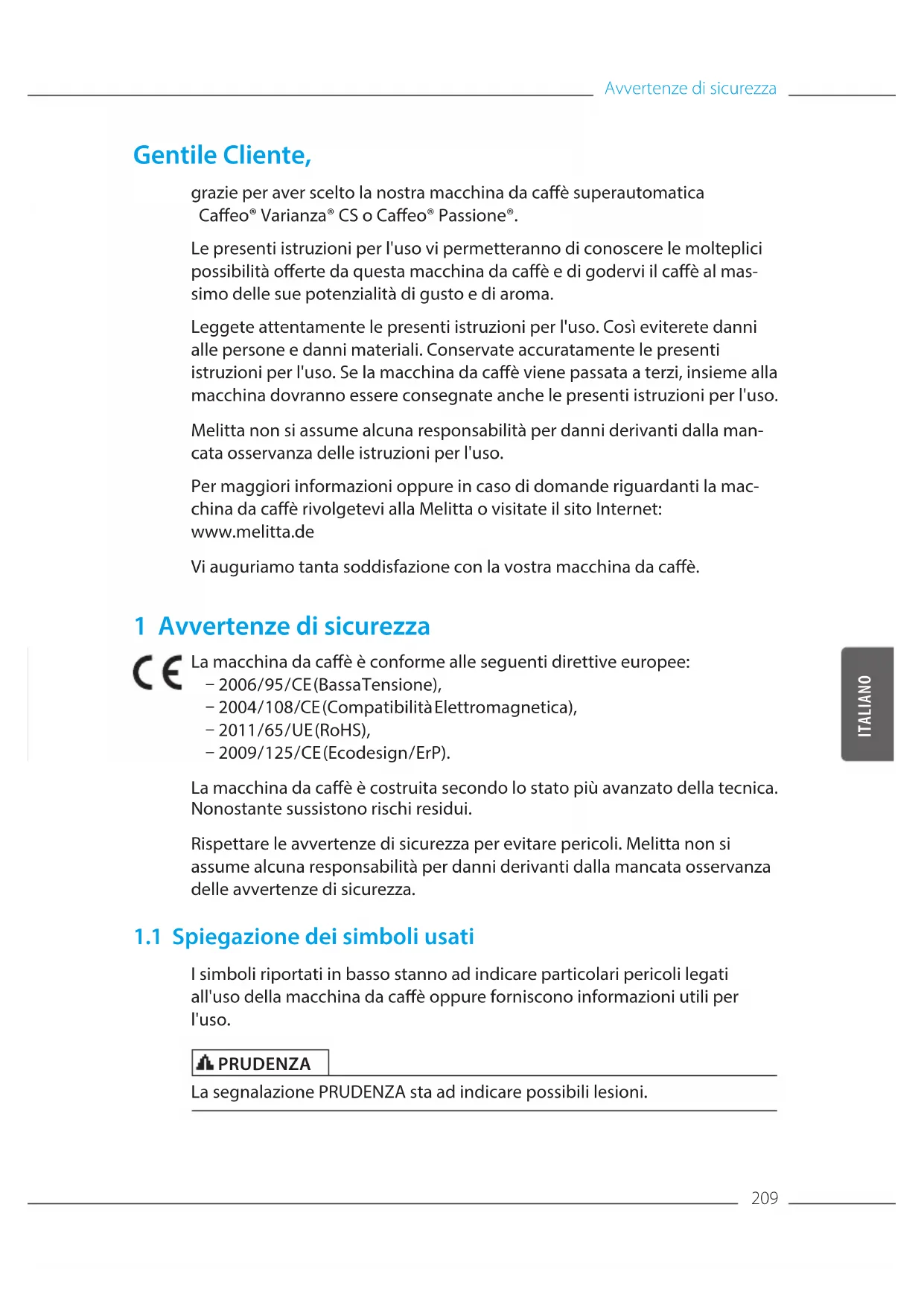 ITALIANO Gentile Cliente, grazie per aver scelto la nostra macchina da caè superautomatica Caeo®Varianza® CS o Caeo® Passione®. Le presenti istruzioni per l'uso vi permetteranno di conoscere le molteplici possibilità oerte da questa macchina da caè e di godervi il caè al mas- simo delle sue potenzialità di gusto e di aroma. Leggete attentamente le presenti istruzioni per l'uso. Così eviterete danni alle persone e danni materiali. Conservate accuratamente le presenti istruzioni per l'uso. Se la macchina da caè viene passata a terzi, insieme alla macchina dovranno essere consegnate anche le presenti istruzioni per l'uso. Melitta non si assume alcuna responsabilità per danni derivanti dalla man- cata osservanza delle istruzioni per l'uso. Per maggiori informazioni oppure in caso di domande riguardanti la mac- china da caè rivolgetevi alla Melitta o visitate il sito Internet: www.melitta.de Vi auguriamo tanta soddisfazione con la vostra macchina da caè. 1 Avvertenze di sicurezza La macchina da caè è conforme alle seguenti direttive europee: ū 2006 / 95 / CE (Bassa Tensione), ū 2004 / 108 /CE (Compatibilità Elettromagnetica), ū 2011 / 65 / UE (RoHS), ū 2009 / 125 / CE (Ecodesign / ErP). La macchina da caè è costruita secondo lo stato più avanzato della tecnica. Nonostante sussistono rischi residui. Rispettare le avvertenze di sicurezza per evitare pericoli. Melitta non si assume alcuna responsabilità per danni derivanti dalla mancata osservanza delle avvertenze di sicurezza.