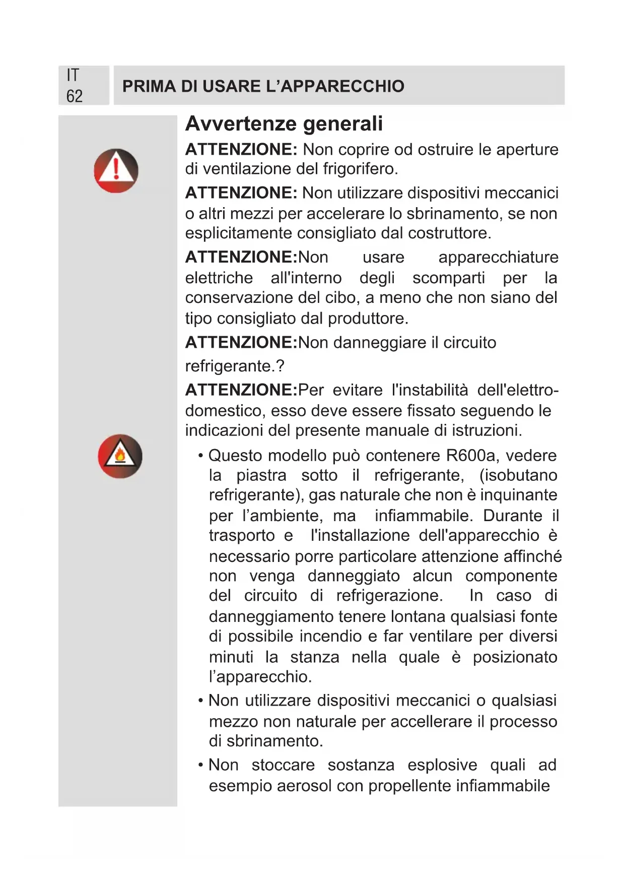 Avvertenze generali ATTENZIONE: Non coprire od ostruire le aperture di ventilazione del frigorifero. ATTENZIONE: Non utilizzare dispositivi meccanici o altri mezzi per accelerare lo sbrinamento, se non esplicitamente consigliato dal costruttore. ATTENZIONE:Non usare apparecchiature elettriche all'interno degli scomparti per la conservazione del cibo, a meno che non siano del tipo consigliato dal produttore. ATTENZIONE:Non danneggiare il circuito refrigerante.? ATTENZIONE:Per evitare l'instabilità dell'elettro- domestico, esso deve essere ssato seguendo le indicazioni del presente manuale di istruzioni.