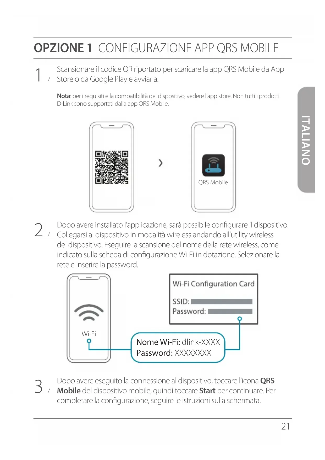Scansionare il codice QR riportato per scaricare la app QRS Mobile da App Store o da Google Play e avviarla. Nota: per i requisiti e la compatibilità del dispositivo, vedere l’app store. Non tutti i prodotti D-Link sono supportati dalla app QRS Mobile. 1 / QRS MobileDopo avere installato l’applicazione, sarà possibile configurare il dispositivo. Collegarsi al dispositivo in modalità wireless andando all’utility wireless del dispositivo. Eseguire la scansione del nome della rete wireless, come indicato sulla scheda di configurazione Wi-Fi in dotazione. Selezionare la rete e inserire la password. 2 / Wi-Fi Nome Wi-Fi: dlink-XXXX Password: XXXXXXXX Dopo avere eseguito la connessione al dispositivo, toccare l’icona QRS Mobile del dispositivo mobile, quindi toccare Start per continuare. Per completare la configurazione, seguire le istruzioni sulla schermata. 3 /22 ITALIANO
