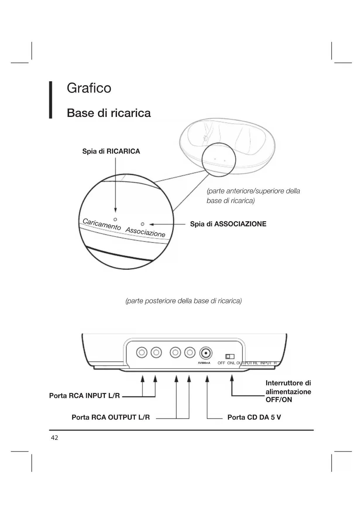 FrançiasEnglish Italiano Español 5V 500mA 5V 500mA 5V 500mA (collegamento facoltativo) Istruzioni di congurazione OFF ONL OUTPUT RL INPUT RUSCITA AUDIO INGRESSO AUDIO 5V 500mA Collegamento della base di ricarica