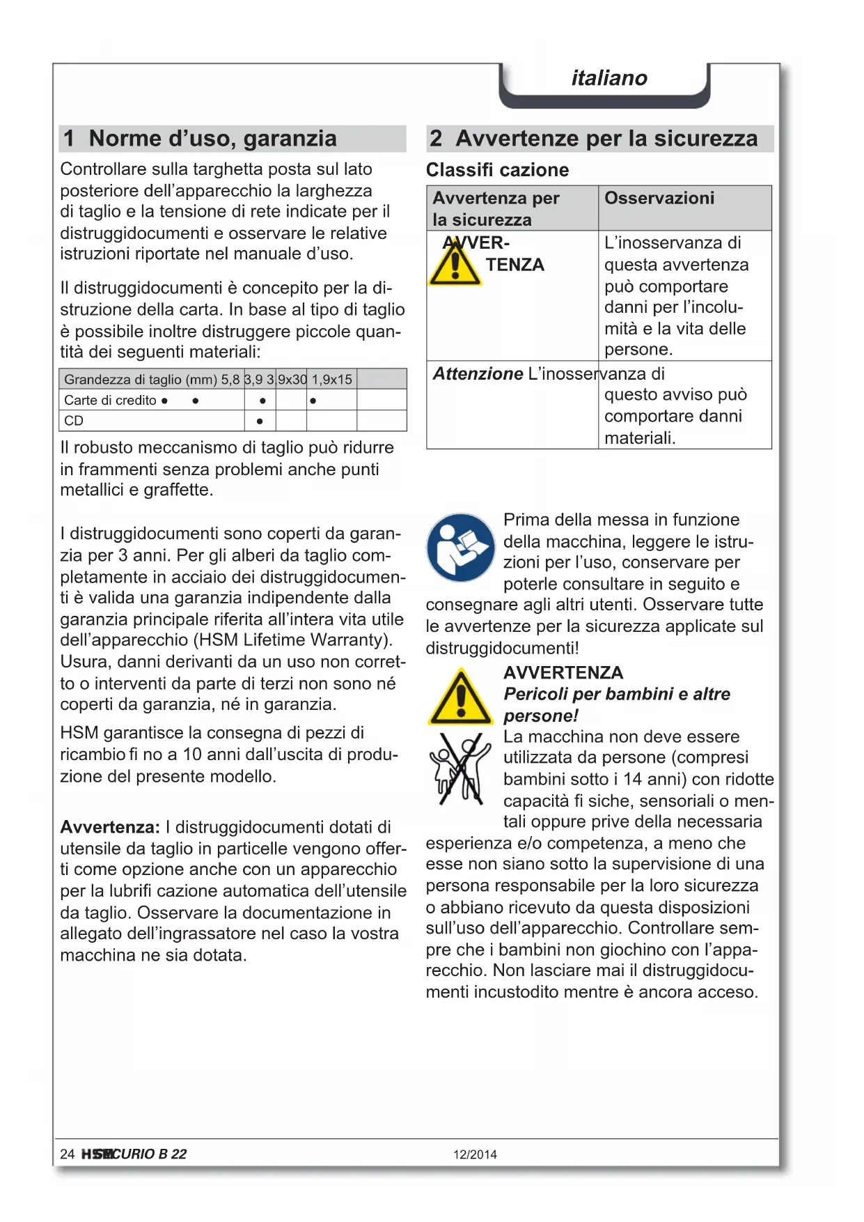 - Direc ve LdSD 2011/65/UE La déclara on de conformité UE est disponible sur demande auprès du fabricant.24 SECURIO B 22 12/2014 italiano 2 Avvertenze per la sicurezza Classifi cazione Avvertenza per la sicurezza Osservazioni AVVER- TENZA L’inosservanza di questa avvertenza può comportare danni per l’incolu- mità e la vita delle persone. Attenzione L’inosservanza di questo avviso può comportare danni materiali. Prima della messa in funzione della macchina, leggere le istru- zioni per l’uso, conservare per poterle consultare in seguito e consegnare agli altri utenti. Osservare tutte le avvertenze per la sicurezza applicate sul distruggidocumenti! AVVERTENZA Pericoli per bambini e altre persone! La macchina non deve essere utilizzata da persone (compresi bambini sotto i 14 anni) con ridotte capacità fi siche, sensoriali o men- tali oppure prive della necessaria esperienza e/o competenza, a meno che esse non siano sotto la supervisione di una persona responsabile per la loro sicurezza o abbiano ricevuto da questa disposizioni sull’uso dell’apparecchio. Controllare sem- pre che i bambini non giochino con l’appa- recchio. Non lasciare mai il distruggidocu- menti incustodito mentre è ancora acceso. 1 Norme d’uso, garanzia Controllare sulla targhetta posta sul lato posteriore dell’apparecchio la larghezza di taglio e la tensione di rete indicate per il distruggidocumenti e osservare le relative istruzioni riportate nel manuale d’uso. Il distruggidocumenti è concepito per la di- struzione della carta. In base al tipo di taglio è possibile inoltre distruggere piccole quan- tità dei seguenti materiali: Grandezza di taglio (mm) 5,8 3,9 3,9x30 1,9x15 Carte di credito ●● ● ● CD ● Il robusto meccanismo di taglio può ridurre in frammenti senza problemi anche punti metallici e graffette. Avvertenza: I distruggidocumenti dotati di utensile da taglio in particelle vengono offer- ti come opzione anche con un apparecchio per la lubrifi cazione automatica dell’utensile da taglio. Osservare la documentazione in allegato dell’ingrassatore nel caso la vostra macchina ne sia dotata. I distruggidocumenti sono coperti da garan- zia per 3 anni. Per gli alberi da taglio com- pletamente in acciaio dei distruggidocumen- ti è valida una garanzia indipendente dalla garanzia principale riferita all’intera vita utile dell’apparecchio (HSM Lifetime Warranty). Usura, danni derivanti da un uso non corret- to o interventi da parte di terzi non sono né coperti da garanzia, né in garanzia. HSM garantisce la consegna di pezzi di ricambio fi no a 10 anni dall’uscita di produ- zione del presente modello.12/2014 SECURIO B 22 25 italiano AVVERTENZA Tensione di rete pericolosa! L’uso improprio della macchina può causare scosse elettriche. – Prima di inserire la spina di rete, assi- curarsi che i dati della tensione e della frequenza della vostra rete elettrica coin- cidano con quelli indicati sulla targhetta. – Assicurarsi che la spina di rete sia facil- mente accessibile. – Evitare penetrazioni d’acqua nel distrug- gidocumenti. Non immergere mai il cavo e la spina di rete in acqua. – Non toccare mai la spina di rete con le mani umide. – Staccare sempre la spina di rete dalla presa afferrando la stessa e mai tirando il cavo di alimentazione. – Utilizzare l’apparecchio esclusivamente in ambienti interni asciutti. Non azionarlo mai in ambienti umidi o sotto la pioggia. Controllare regolarmente che apparecchio e cavo non siano danneggiati. Spegnere il distruggi- documenti se danneggiato o se non funziona correttamente, nonché in caso di cambio di posto o durante la pulizia, ed estrarre la spina di rete. – Tenere l’apparecchio, la spina di rete e il cavo di rete lontani da fi amme libere e superfi ci incandescenti. Le feritoie di ventilazione non devono essere coperte e deve essere mantenuta una distanza min di 5 cm dalla parete o da mobili. I lavori di assistenza legati alla rimozione delle coperture del corpo macchina devono essere eseguiti unicamente dal servizio