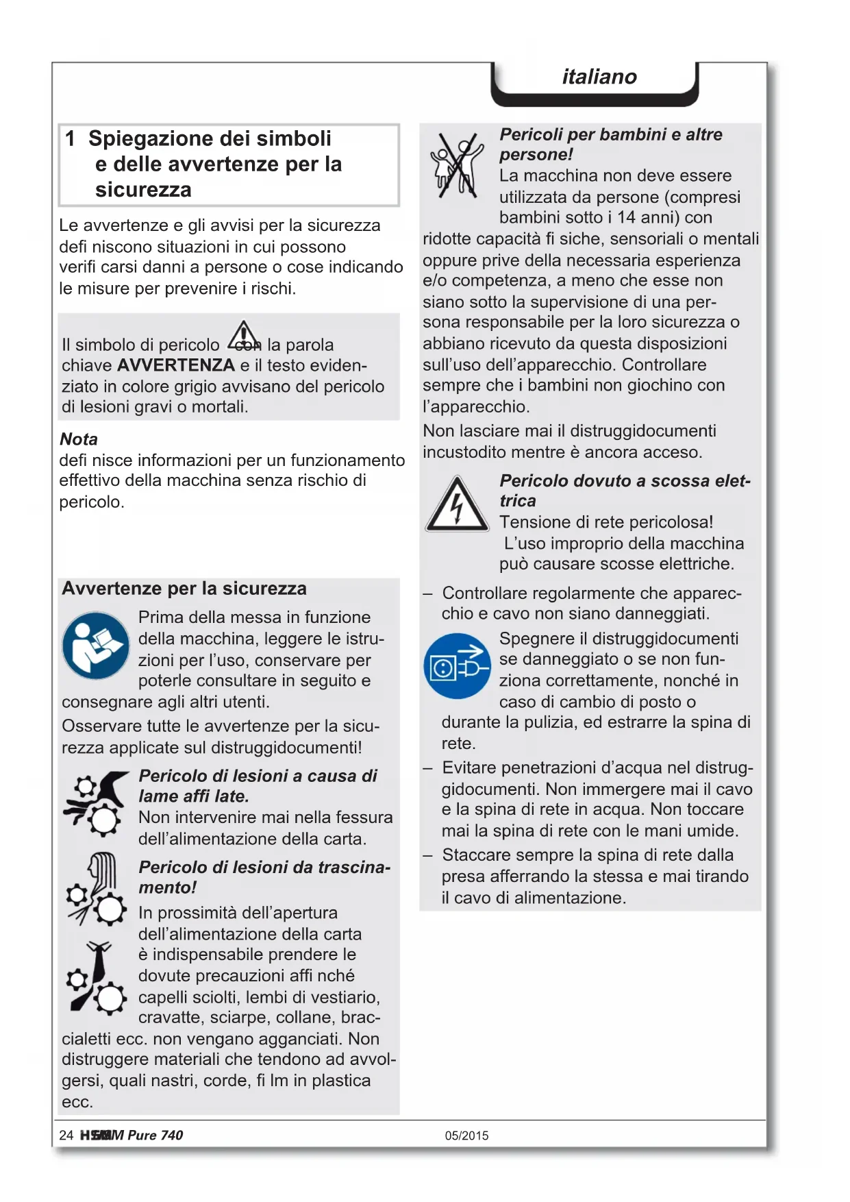 Poids 50 kg 56 kg Vitesse de coupe 70 mm/s 60 mm/s Largeur d’introduction 400 mm Branchement 230 V, 50 Hz 120 V, 60 Hz 220 V, 60 Hz Puissance consommée avec nbre max. de feuilles 590 W Mode de fonctionnement Fonctionnement permanent Conditions ambiantes d’utilisation : Température Humidité relative de l’air Hauteur au-dessus NN -10 °C à +25 °C max. 90 %, sans condensation max. 2 000 m Dimensions L x P x H (mm) 620 x 487 x 889 Volume du collecteur 145 l Niveau sonore (Marche à vide / charge) 56 dB(A) / 59-63 dB(A)24 HSM Pure 740 05/2015 italiano 1 Spiegazione dei simboli e delle avvertenze per la sicurezza Le avvertenze e gli avvisi per la sicurezza defi niscono situazioni in cui possono verifi carsi danni a persone o cose indicando le misure per prevenire i rischi. Nota defi nisce informazioni per un funzionamento effettivo della macchina senza rischio di pericolo. Il simbolo di pericolo con la parola chiave AVVERTENZA e il testo eviden- ziato in colore grigio avvisano del pericolo di lesioni gravi o mortali. Avvertenze per la sicurezza Prima della messa in funzione della macchina, leggere le istru- zioni per l’uso, conservare per poterle consultare in seguito e consegnare agli altri utenti. Osservare tutte le avvertenze per la sicu- rezza applicate sul distruggidocumenti! Pericolo di lesioni a causa di lame affi late. Non intervenire mai nella fessura dell’alimentazione della carta. Pericolo di lesioni da trascina- mento! In prossimità dell’apertura dell’alimentazione della carta è indispensabile prendere le dovute precauzioni affi nché capelli sciolti, lembi di vestiario, cravatte, sciarpe, collane, brac- cialetti ecc. non vengano agganciati. Non distruggere materiali che tendono ad avvol- gersi, quali nastri, corde, fi lm in plastica ecc. Pericoli per bambini e altre persone! La macchina non deve essere utilizzata da persone (compresi bambini sotto i 14 anni) con ridotte capacità fi siche, sensoriali o mentali oppure prive della necessaria esperienza e/o competenza, a meno che esse non siano sotto la supervisione di una per- sona responsabile per la loro sicurezza o abbiano ricevuto da questa disposizioni sull’uso dell’apparecchio. Controllare sempre che i bambini non giochino con l’apparecchio. Non lasciare mai il distruggidocumenti incustodito mentre è ancora acceso. Pericolo dovuto a scossa elet- trica Tensione di rete pericolosa! L’uso improprio della macchina può causare scosse elettriche. – Controllare regolarmente che apparec- chio e cavo non siano danneggiati. Spegnere il distruggidocumenti se danneggiato o se non fun- ziona correttamente, nonché in caso di cambio di posto o durante la pulizia, ed estrarre la spina di rete. – Evitare penetrazioni d’acqua nel distrug- gidocumenti. Non immergere mai il cavo e la spina di rete in acqua. Non toccare mai la spina di rete con le mani umide. – Staccare sempre la spina di rete dalla presa afferrando la stessa e mai tirando il cavo di alimentazione.05/2015 HSM Pure 740 25 italiano 2 Norme d’uso, garanzia I distruggidocumenti sono coperti da garanzia per 2 anni. Per gli alberi da taglio completamente in acciaio dei distruggido- cumenti è valida una garanzia indipendente dalla garanzia principale riferita all’intera vita utile dell’apparecchio (HSM Lifetime Warranty). Usura, danni derivanti da un uso non corretto o interventi da parte di terzi non sono né coperti da garanzia, né in garanzia. HSM garantisce la consegna di pezzi di ricambio fi no a 10 anni dall’uscita di produ- zione del presente modello. Il distruggidocumenti è concepito per la ridu- zione di carta e di CD/DVD e carte clienti e di credito in piccole quantità. Il robusto utensile da taglio può ridurre in frammenti senza problemi anche punti metallici e graffette. 3 Panoramica Elementi di comando e visualizzazione Messaggi Contenitore pieno Messaggi Pronto per il funzionamento Messaggi Meccanismo di taglio bloccato Sportello aperto / Elemento di sicurezza premuto Tastiera di comando Tasto di inversione 1 Sportello 2 Avvertenze per la sicurezza 3 Fotocellula 4 Unità di comando e visualizzazione 5 Elemento di sicurezza 6 Targhetta 7 Interruttore di rete 1 2 3 4 5 6 726 HSM Pure 740 05/2015 italiano 4 Messa in funzione AVVERTENZA Tensione di rete pericolosa! L’uso improprio della macchina può cau- sare scosse elettriche. – Utilizzare l’apparecchio esclusivamente in ambienti interni asciutti. Non azionarlo mai in ambienti umidi o sotto la pioggia. – Tenere l’apparecchio, la spina di rete e il cavo di rete lontani da fi amme libere e superfi ci incandescenti. Le feritoie di ventilazione non devono essere coperte e deve essere mantenuta una distanza min di 5 cm dalla parete o da mobili. – Assicurarsi che la spina di rete sia facil- mente accessibile. – Prima di inserire la spina di rete, assi- curarsi che i dati della tensione e della frequenza della vostra rete elettrica coin- cidano con quelli indicati sulla targhetta. 5 Messa in esercizio