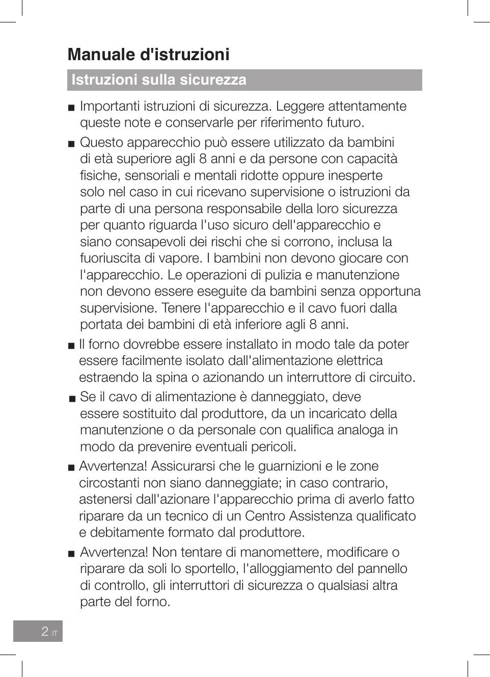 utilizzato da bambini di età superiore agli 8 anni e da persone con capacità fisiche, sensoriali e mentali ridotte oppure inesperte solo nel caso in cui ricevano supervisione o istruzioni da parte di una persona responsabile della loro sicurezza per quanto riguarda l'uso sicuro dell'apparecchio e siano consapevoli dei rischi che si corrono, inclusa la fuoriuscita di vapore. I bambini non devono giocare con l'apparecchio. Le operazioni di pulizia e manutenzione non devono essere eseguite da bambini senza opportuna supervisione. Tenere l'apparecchio e il cavo fuori dalla portata dei bambini di età inferiore agli 8 anni. Importanti istruzioni di sicurezza Utilizzo del forno